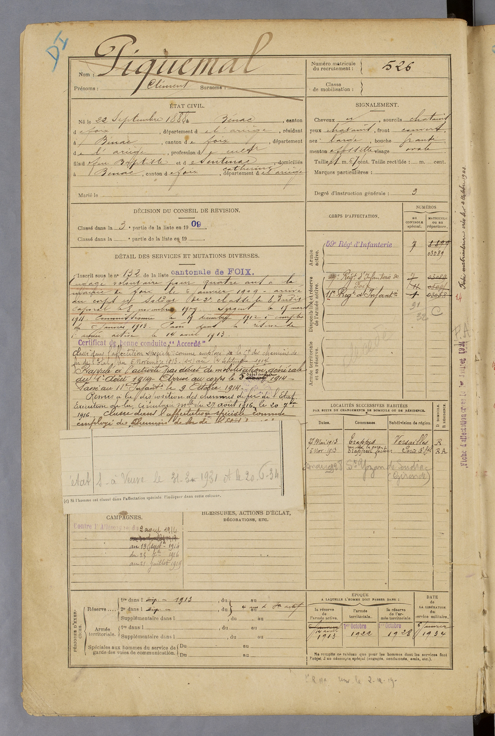 | Piquemal | Clement | FOIX | 129 W 43 | 1908 | Bénac | Bénac | 526 |