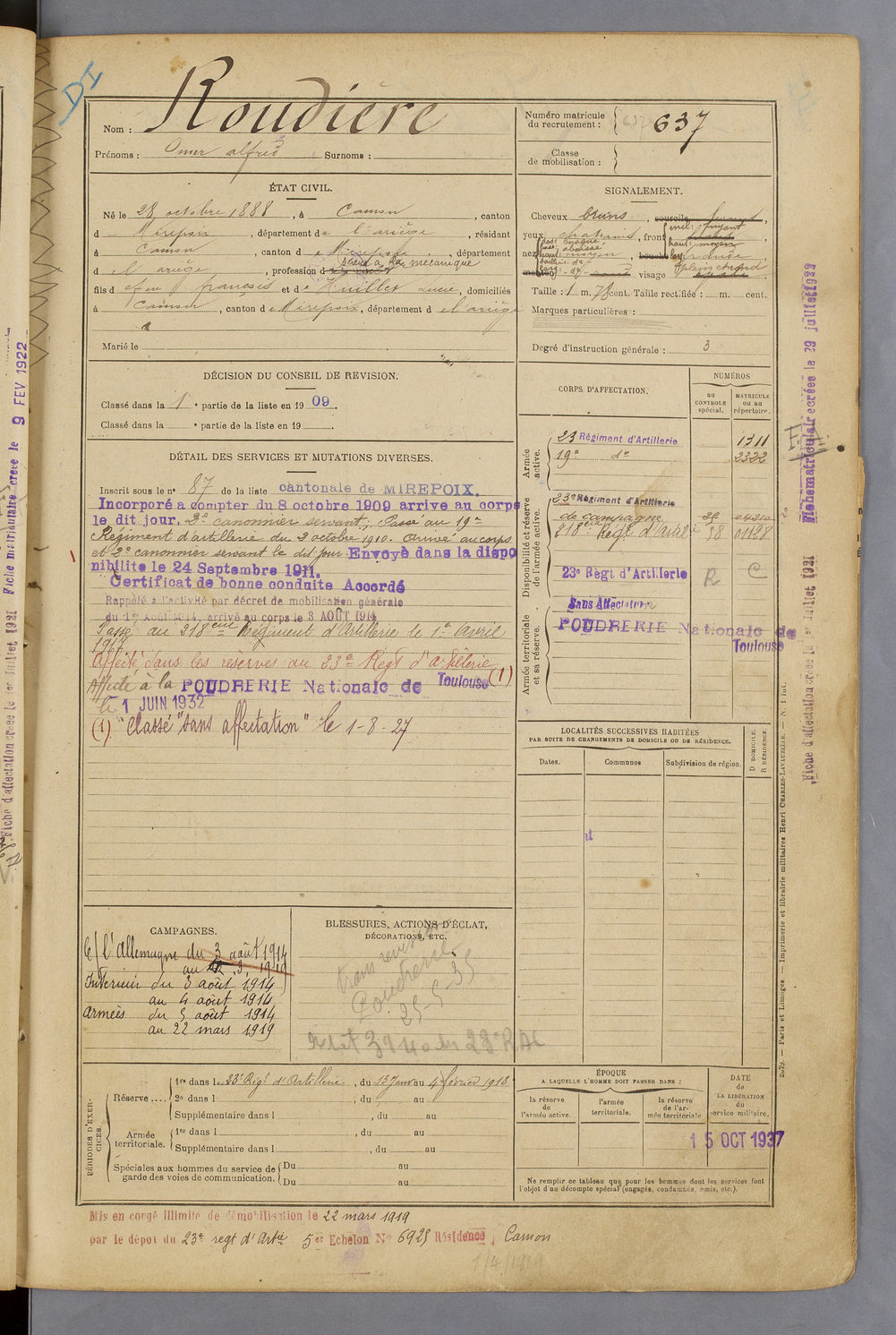 | Roudiere | Omar Alfred | FOIX | 129 W 43 | 1908 | Camon | Camon | 637 |