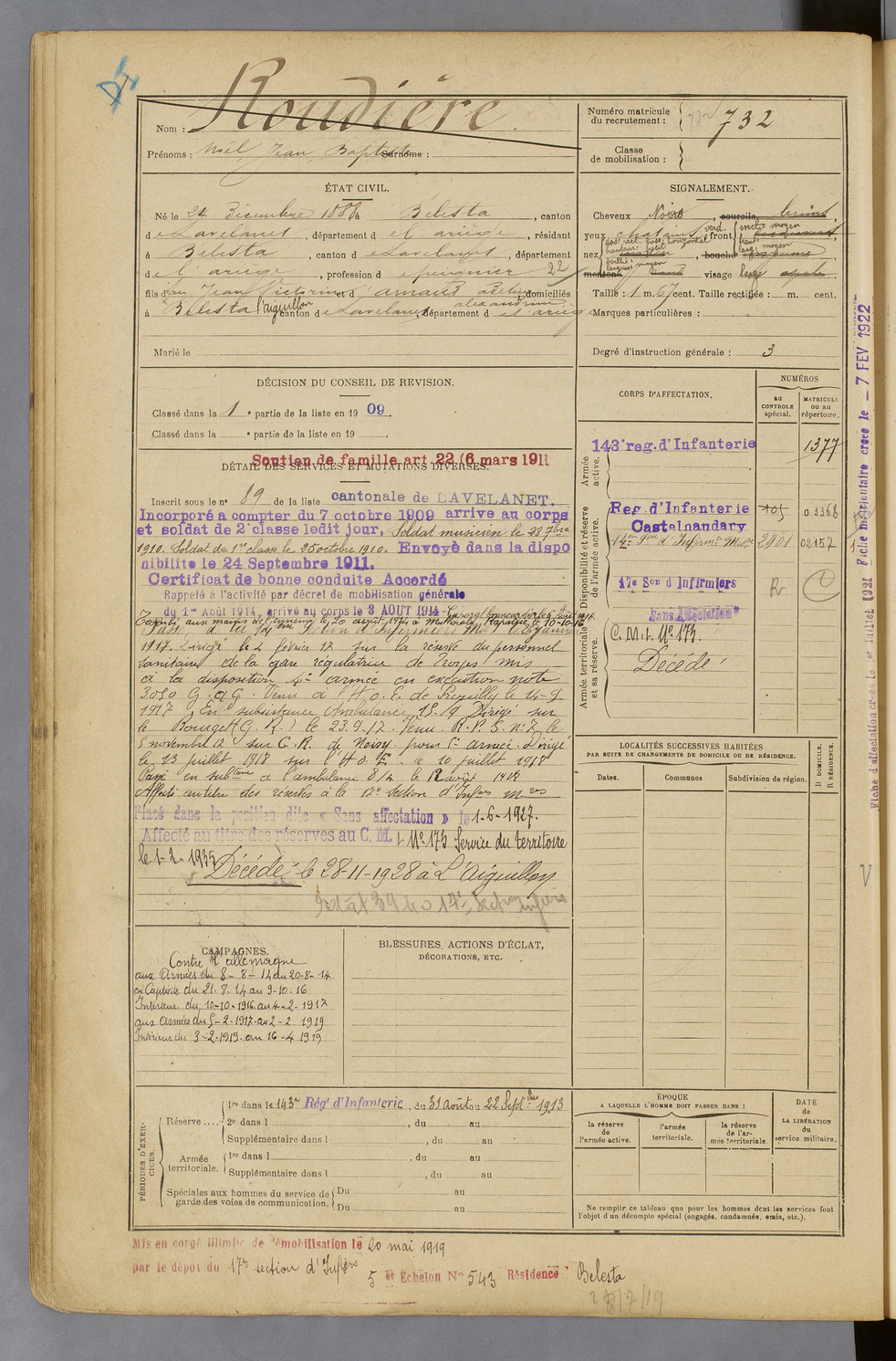 | Roudiére | Nöel Jean Baptiste | FOIX | 129 W 43 | 1908 | Bélesta | Bélesta | 732 |