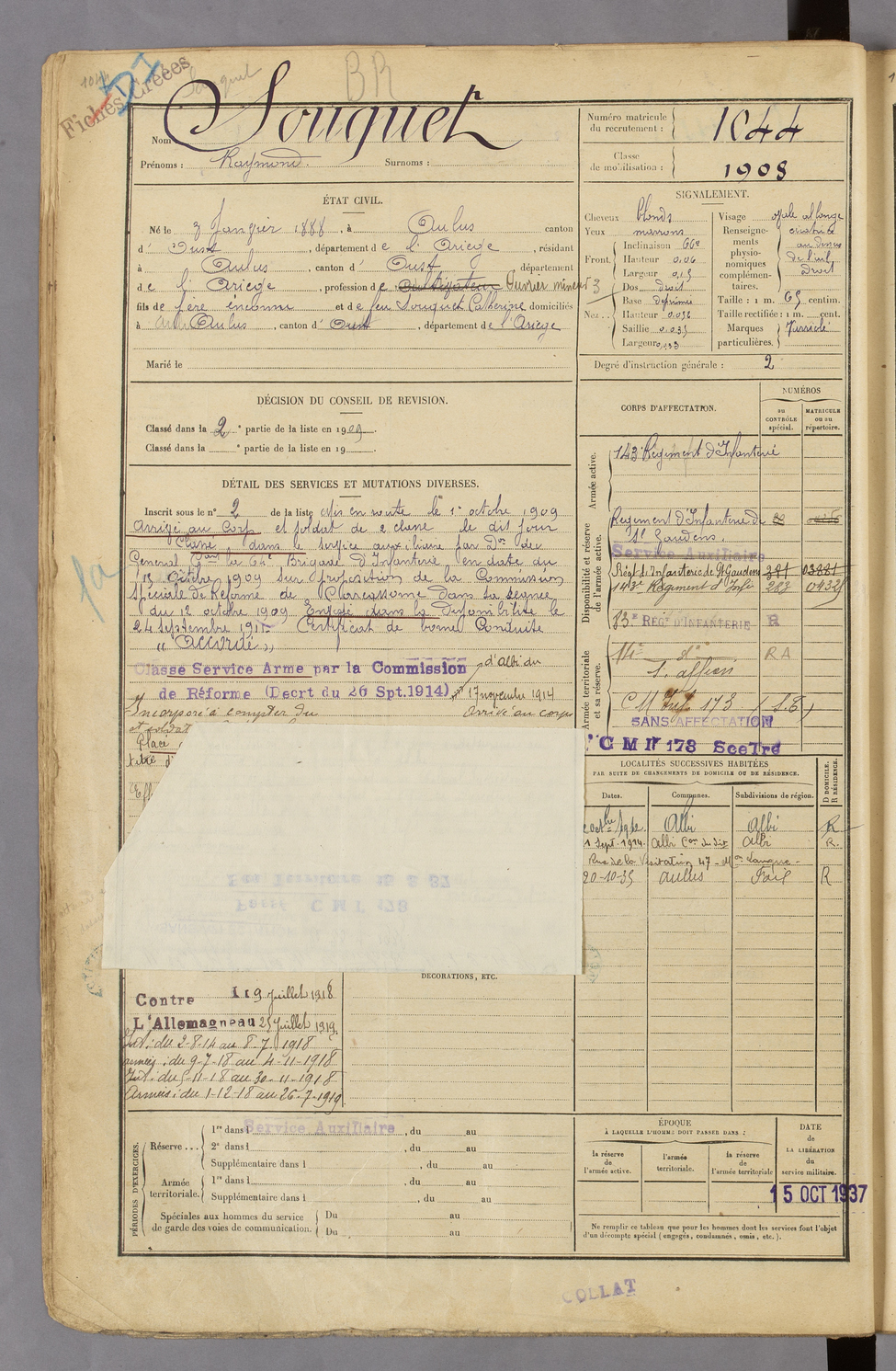 | Subra | Jean Pierre dit Bieusses | FOIX | 129 W 44 | 1908 | Boussenac | Boussenac | 1045 |