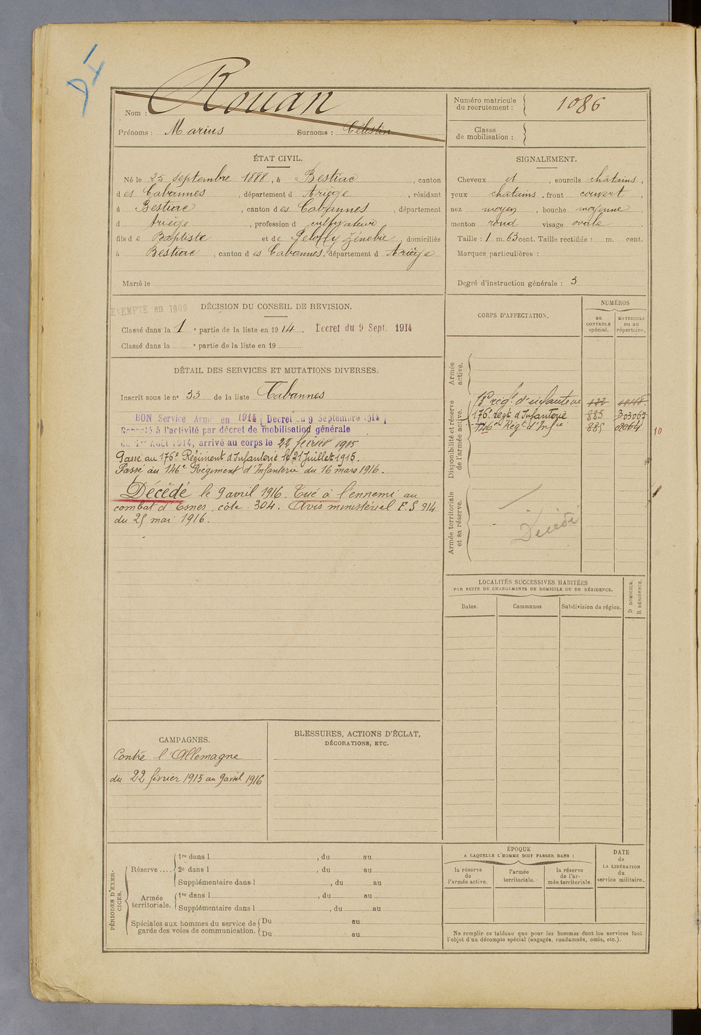 | Rieu | Louis dit Coumère | FOIX | 129 W 45 | 1908 | Soueix | Soueix | 1084 |