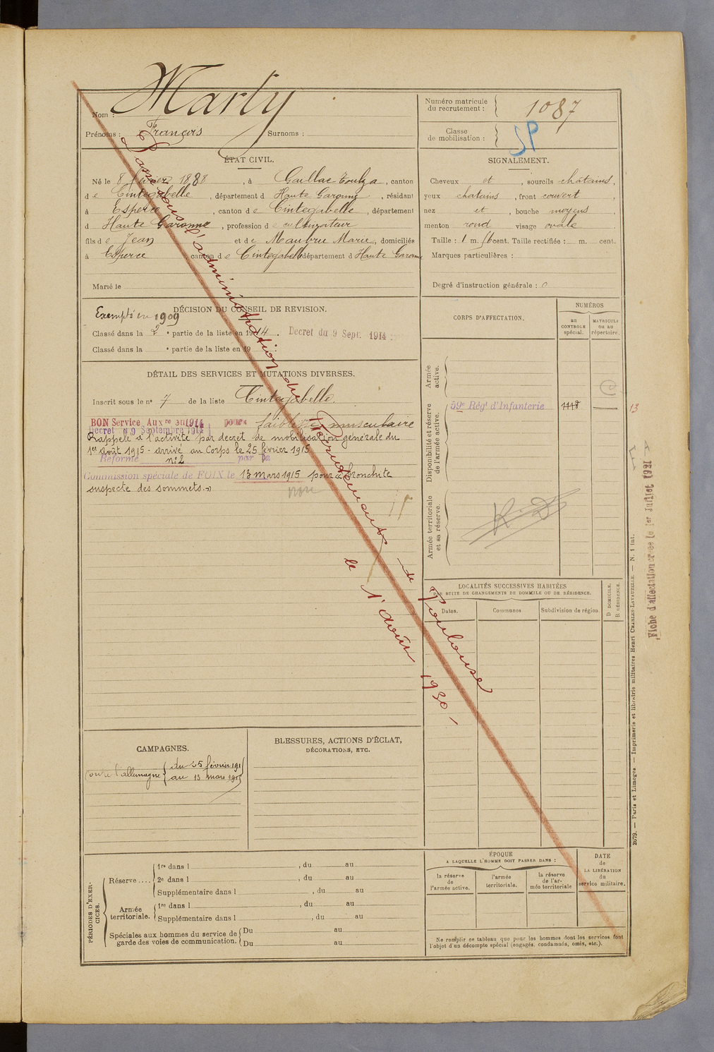 | Marty | François | FOIX | 129 W 44 | 1908 | Gaillac toulza | Esperce | 1087 |