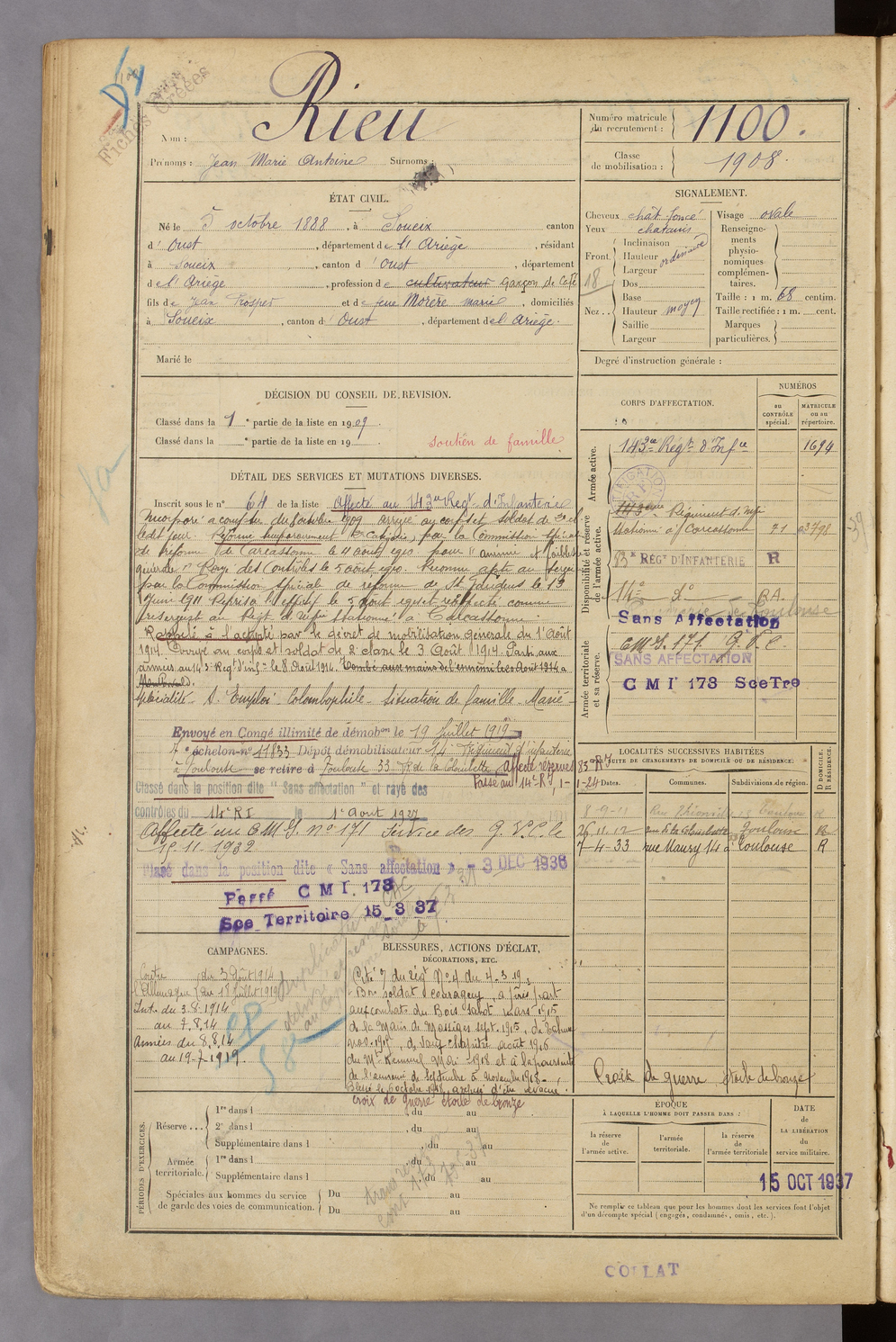 | Rieu | Jean Marie Antoine | FOIX | 129 W 45 | 1908 | Soueix | Soueix | 1100 |