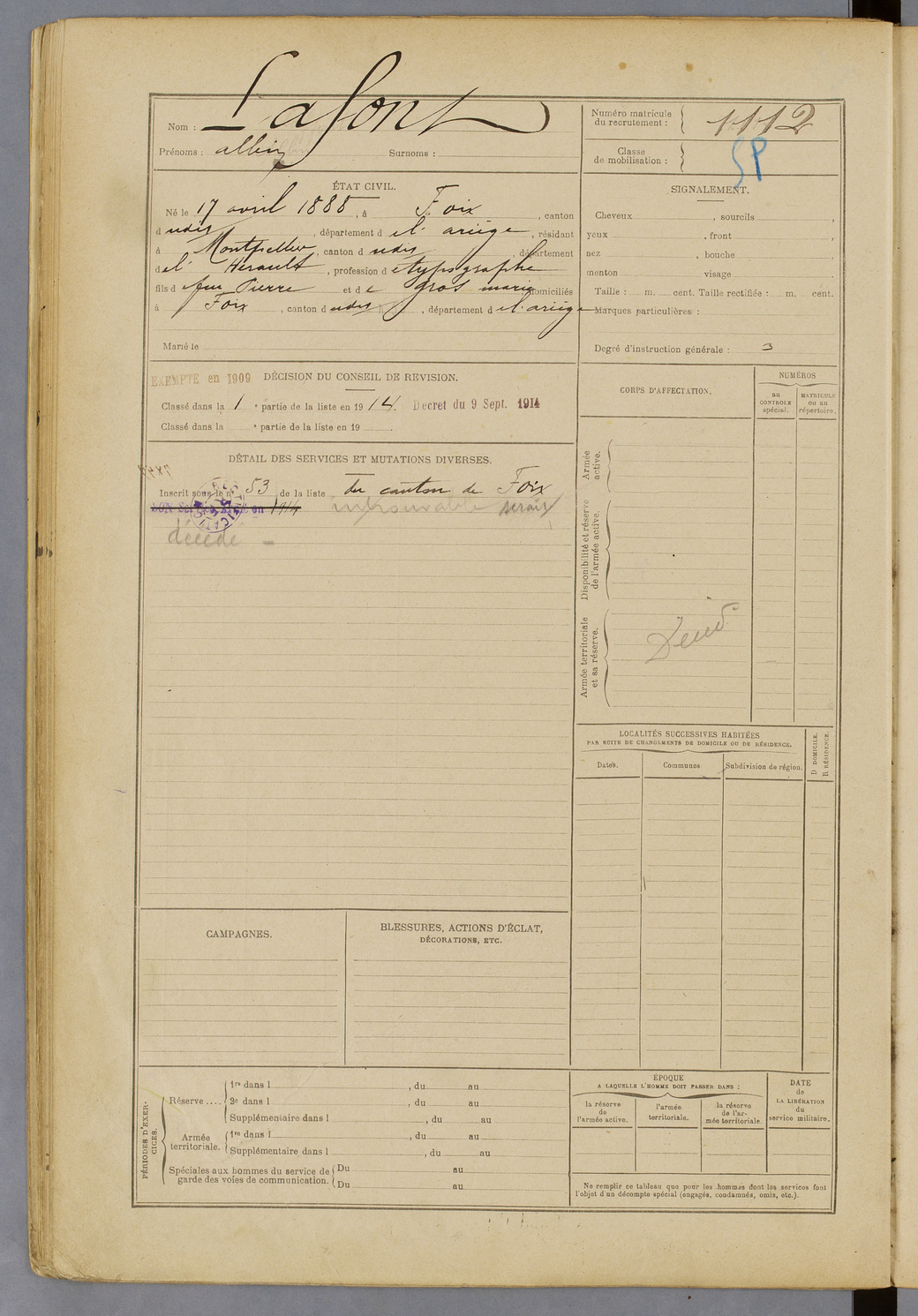 | Lafont | Allain | FOIX | 129 W 44 | 1908 | Foix | Montpellier | 1112 |