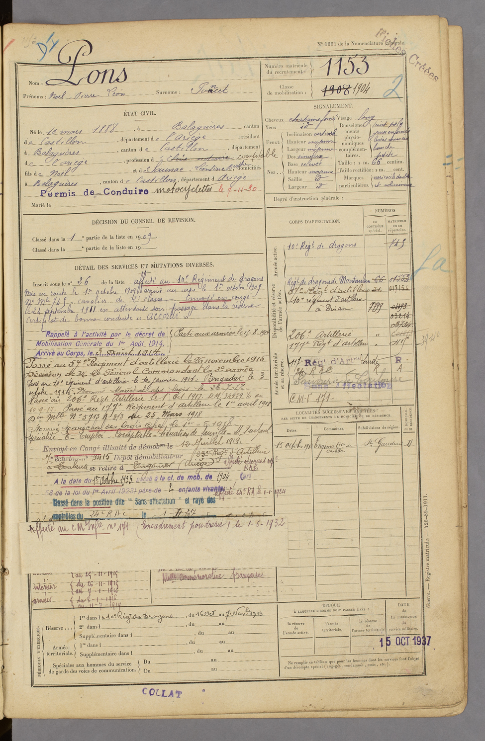 | Pons | Noel Pierre Léon dit Poncet | FOIX | 129 W 45 | 1908 | Balaguères | Balaguères | 1153 |