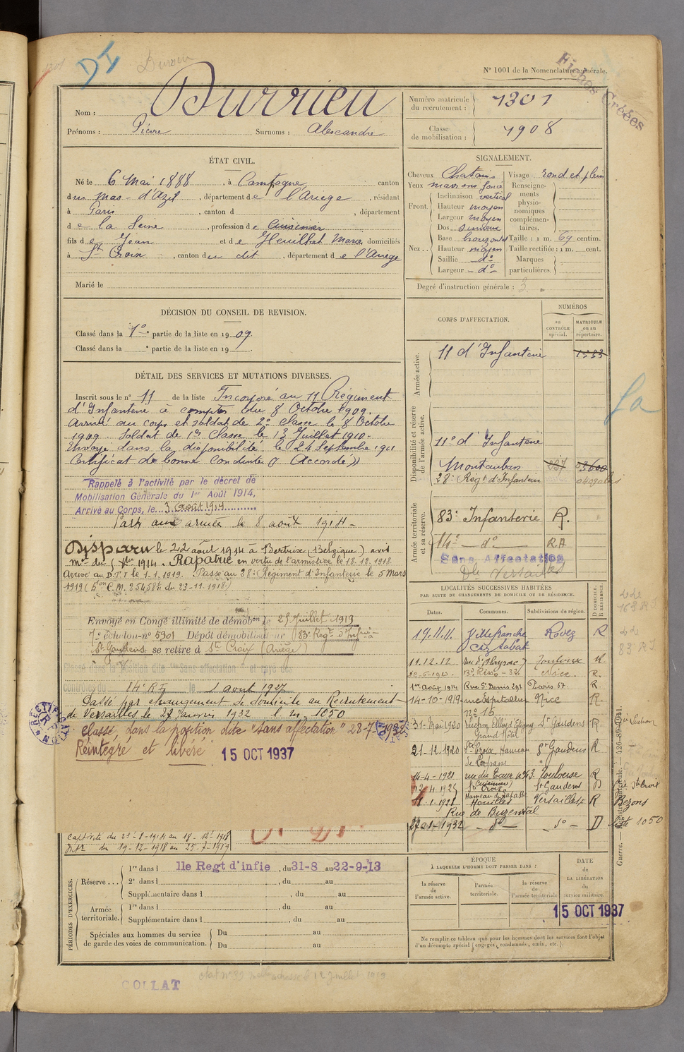 | Durrieu | Pierre dit Alexandre | FOIX | 129 W 45 | 1908 | Campagne-sur-Arize | Paris | 1301 |