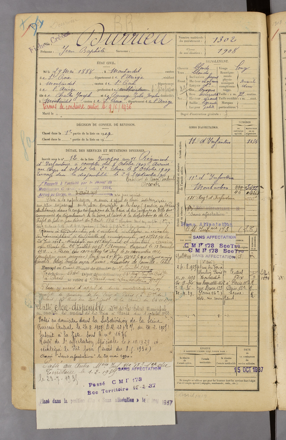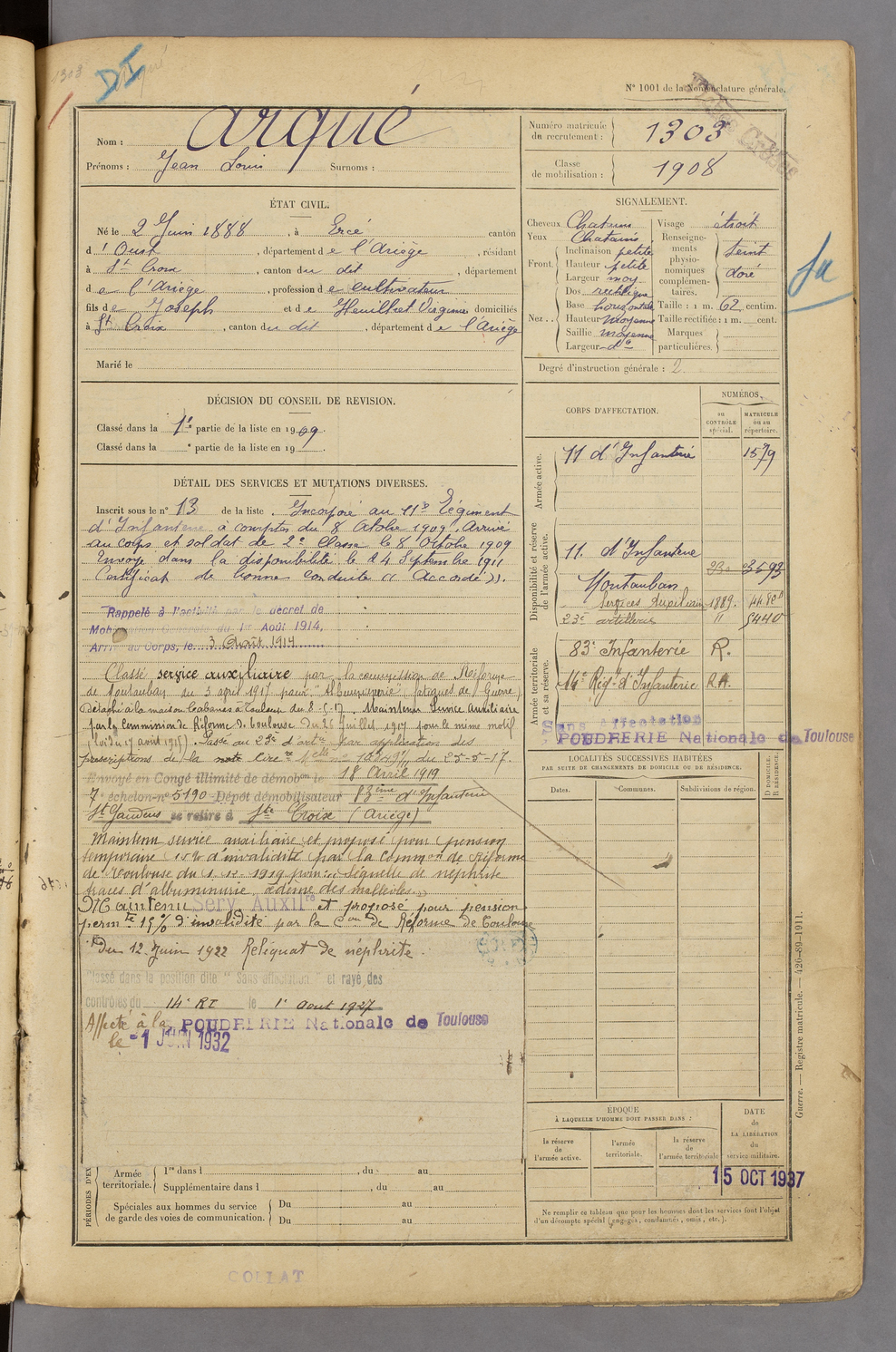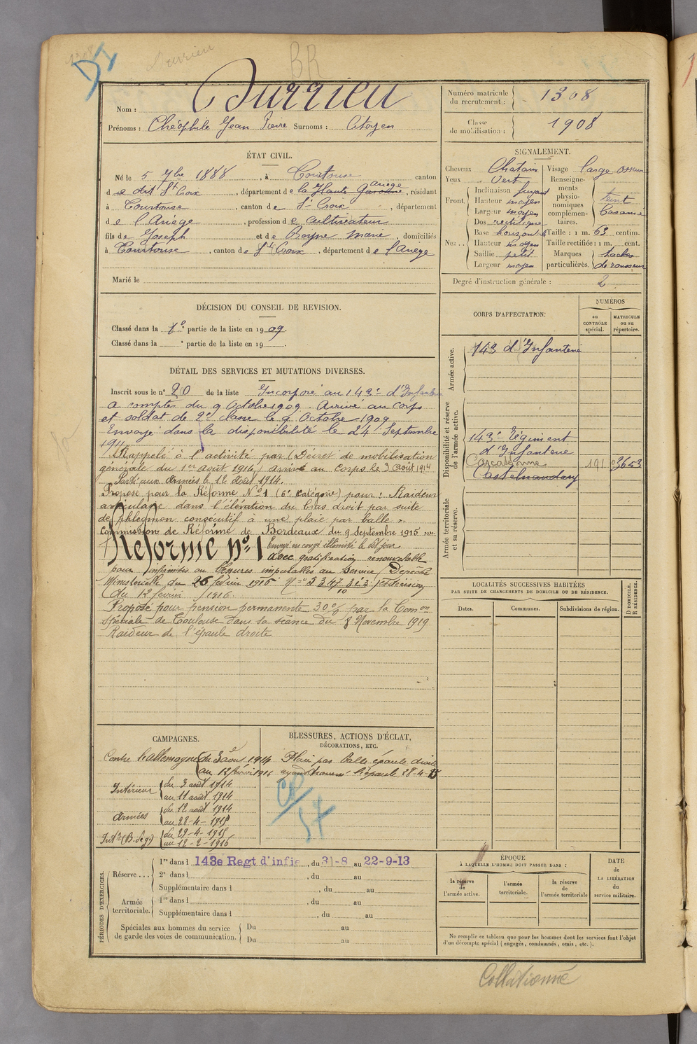 | Durrieu | Théophile Jean Pierre dit Citoyen | FOIX | 129 W 45 | 1908 | Tourtouse | Tourtouse | 1308 |