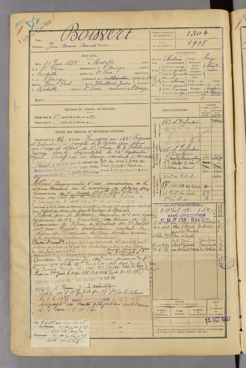 | Boissert | Jean Marie Armand | FOIX | 129 W 45 | 1908 | Bedaille | Bedaille | 1304 |