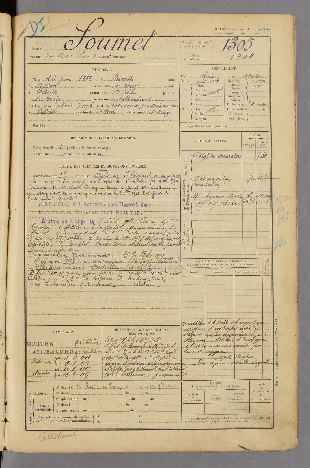 | Soumet | Jean Marie Pierre Armand | FOIX | 129 W 45 | 1908 | Bedaille | Bedaille | 1305 |