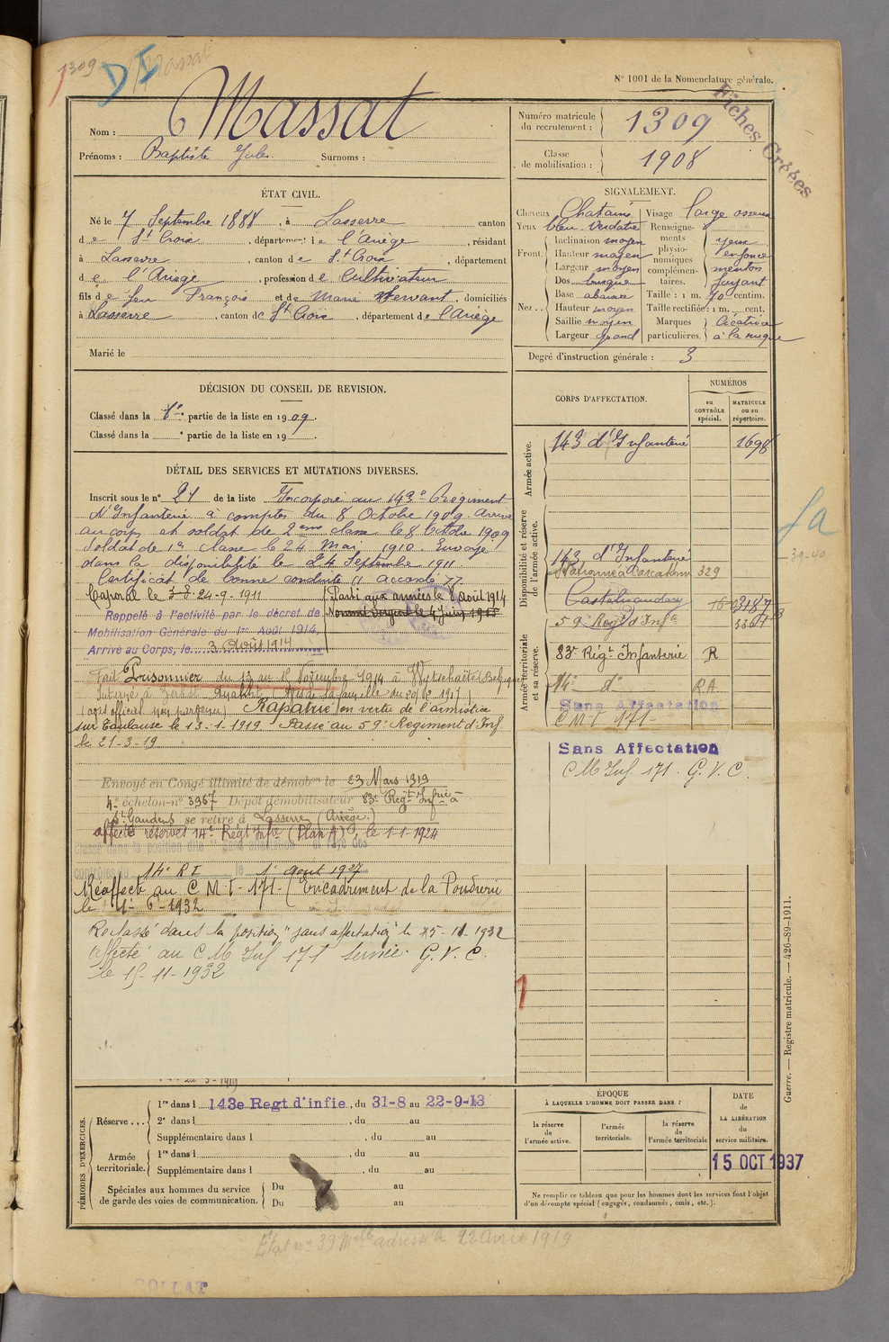 | Massat | Baptiste Jules | FOIX | 129 W 45 | 1908 | Lasserre | Lasserre | 1309 |