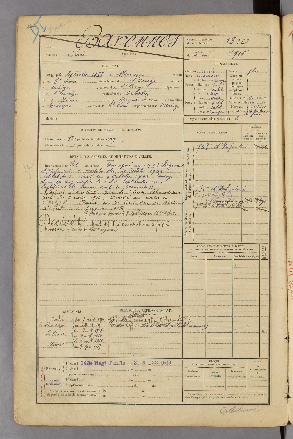 | Barennes | Louis | FOIX | 129 W 45 | 1908 | Mérigon | Mérigon | 1310 |