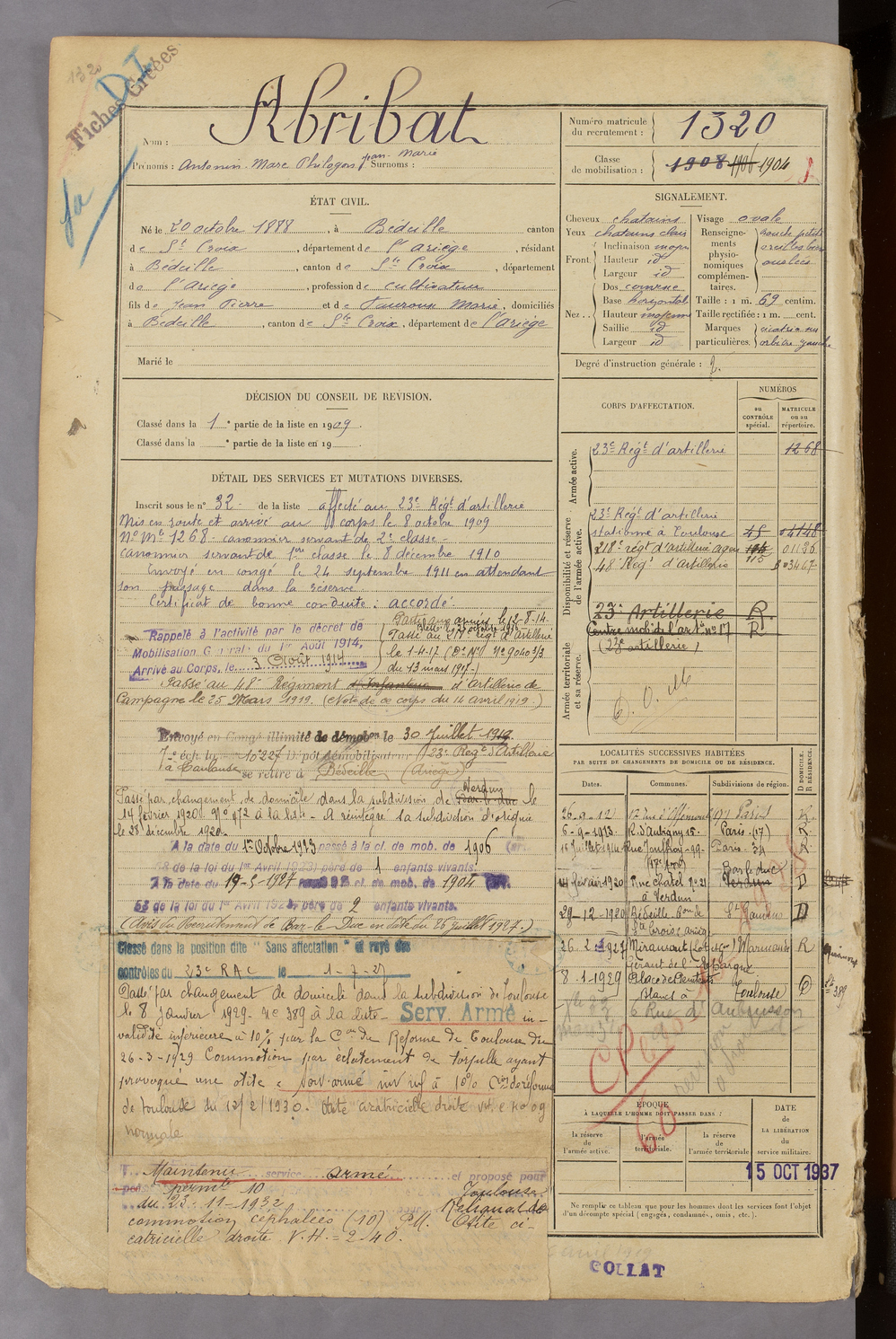 | Abribat | Antoine Marie Philognis Jean Marie | FOIX | 129 W 45 | 1908 | Bedeille | Bedeille | 1320 |