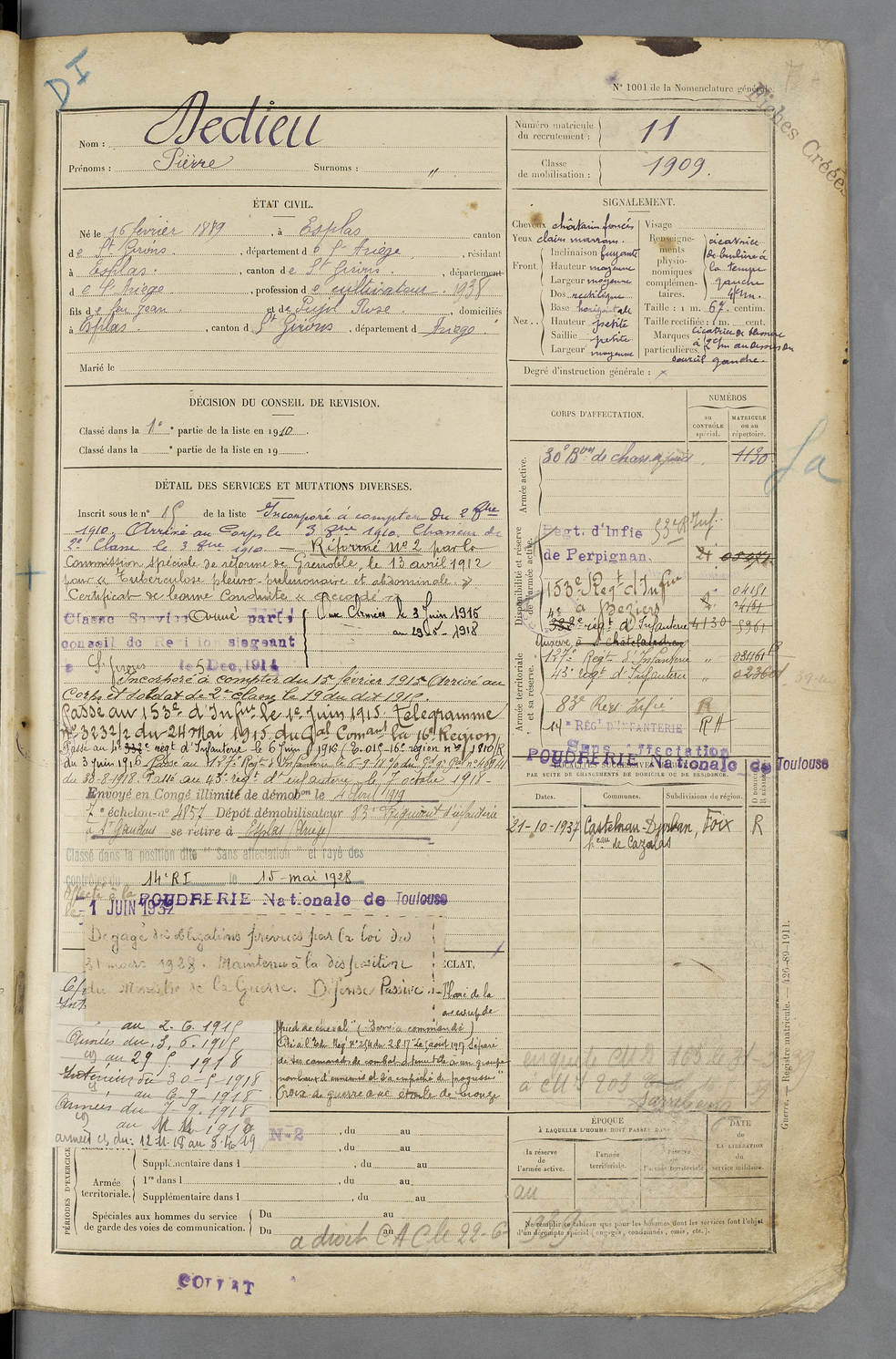 | Dedieu | Pierre | FOIX | 129 W 50 | 1909 | Esplas | Saint-Girons | 11 |