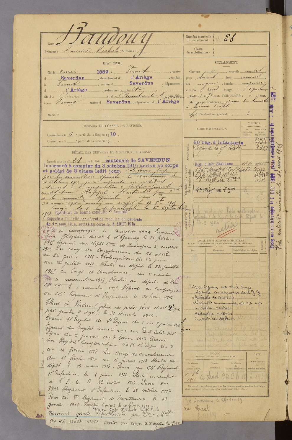 | Baudouy | Maurice Michel | FOIX | 129 W 47 | 1909 | Vernet (Le) | Vernet (Le) | 28 |