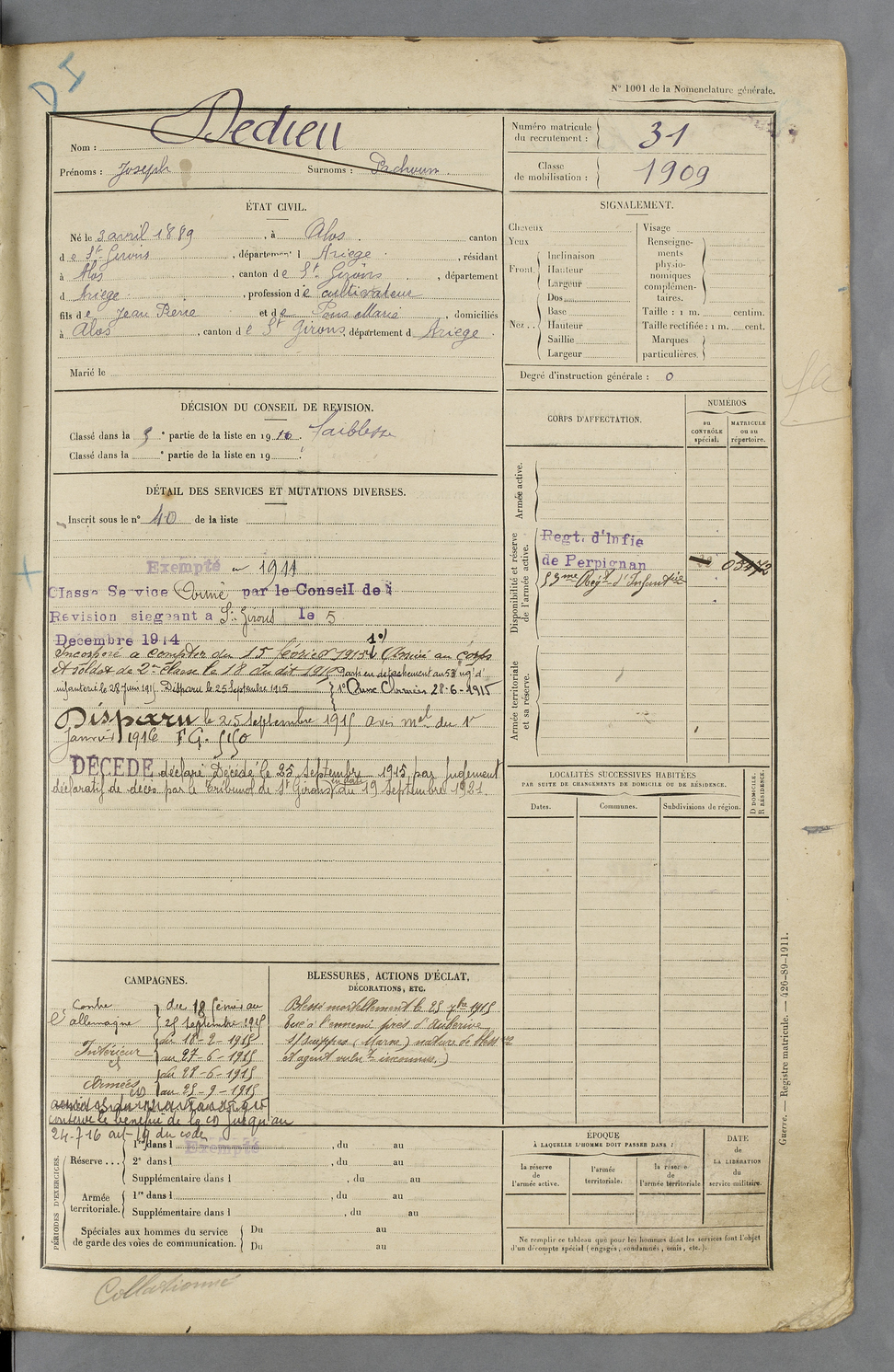 | Dedieu | Joseph | FOIX | 129 W 50 | 1909 | Alos | Alos | 31 |