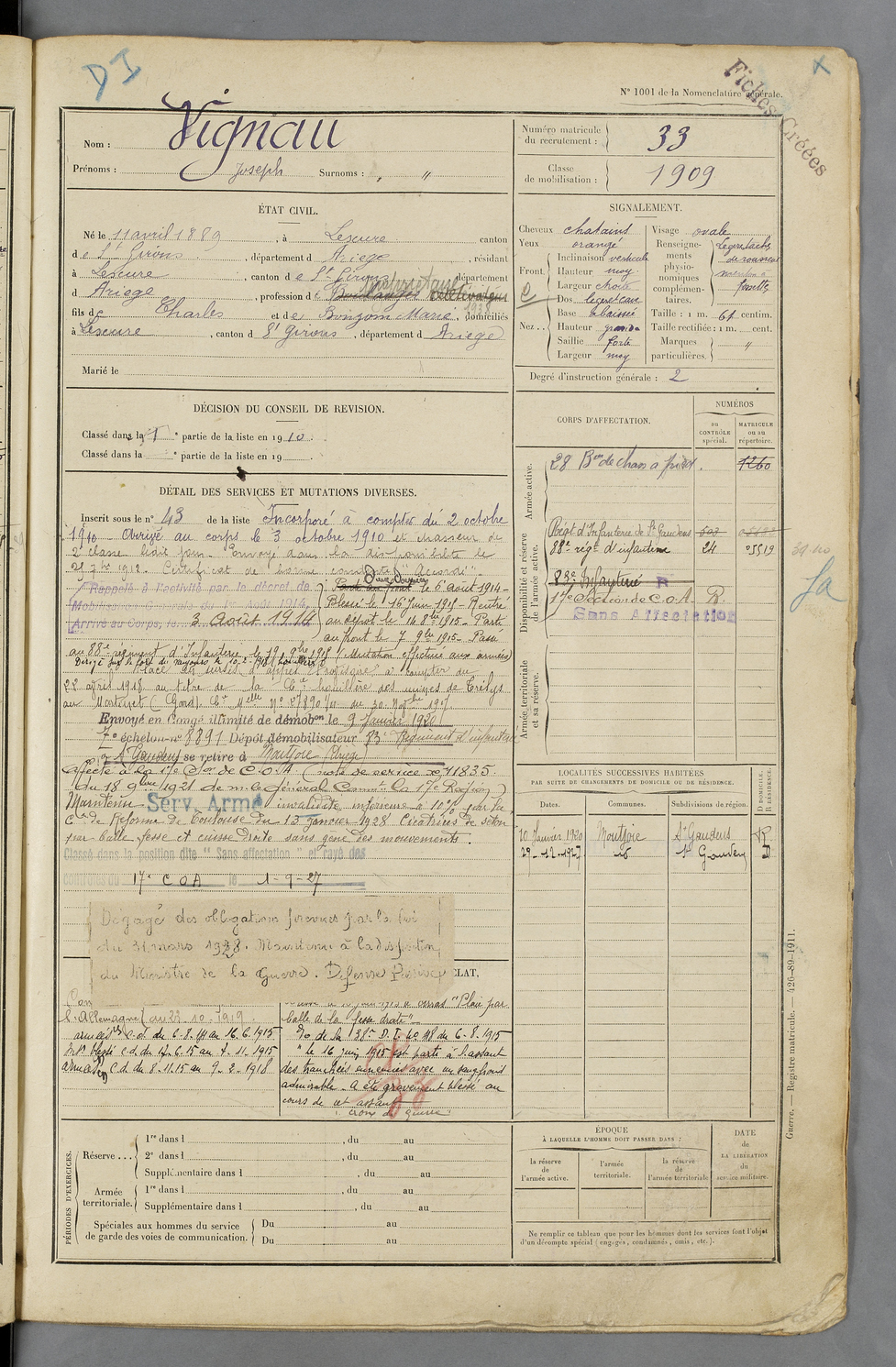 | Vignau | Joseph | FOIX | 129 W 50 | 1909 | Lescure | Lescure | 33 |