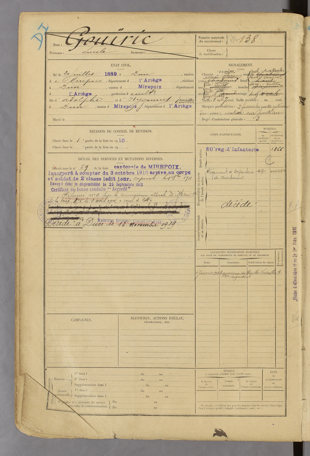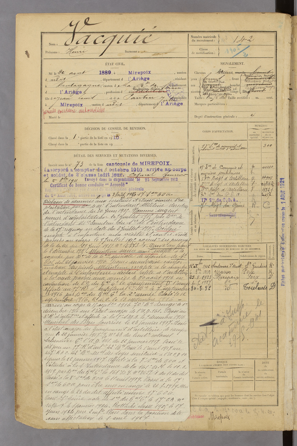 | Vacquié | Henri | FOIX | 129 W 47 | 1909 | Mirepoix | Montagagne | 142 |