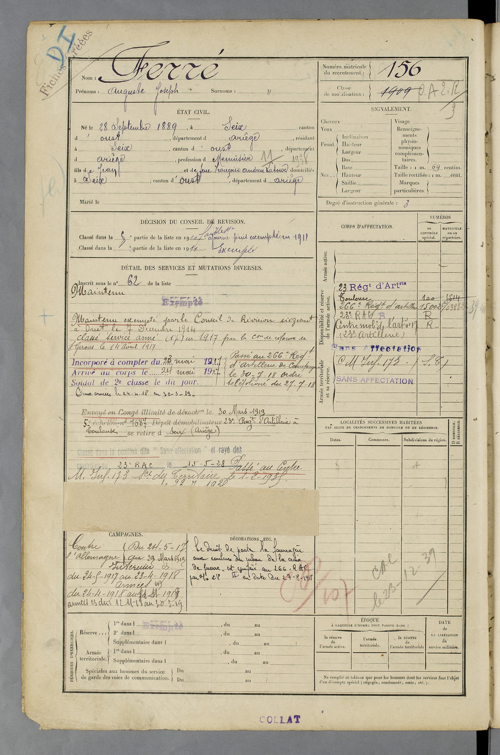| Ferré | Auguste Joseph | FOIX | 129 W 50 | 1909 | Seix | Seix | 156 |