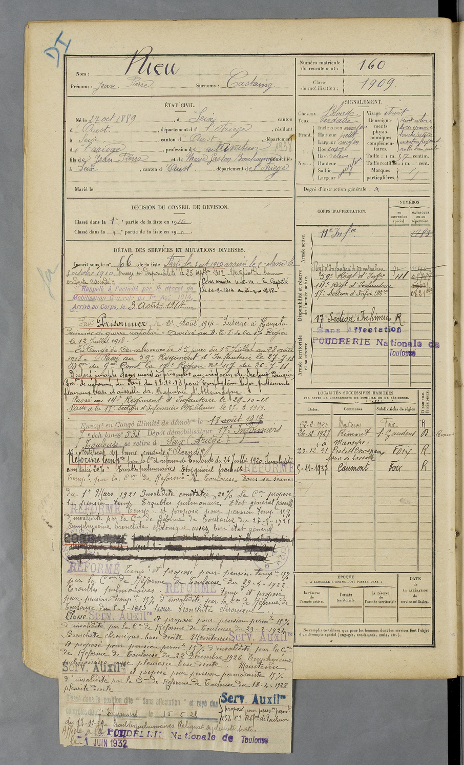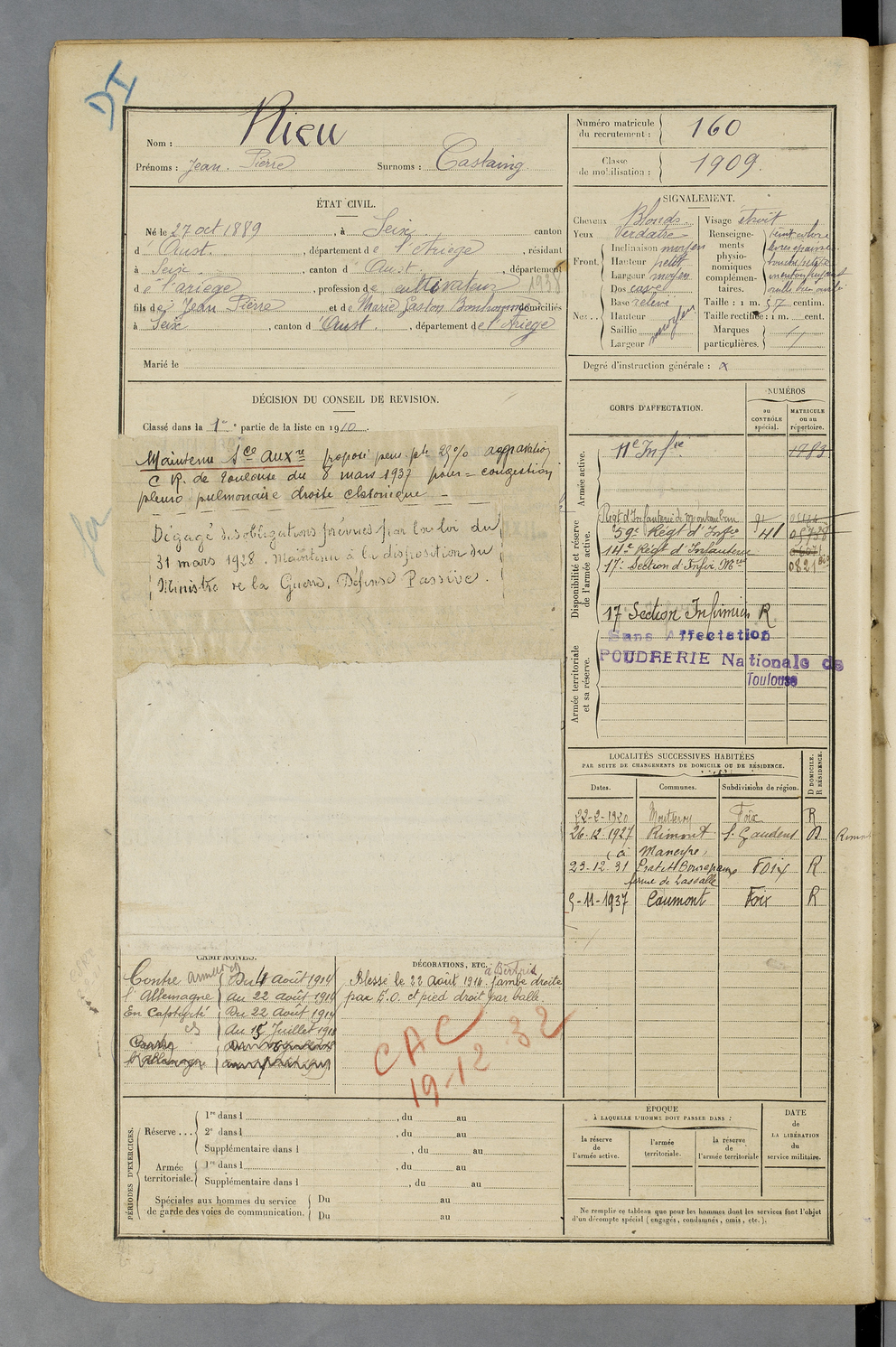| Rieu | Jean Pierre | FOIX | 129 W 50 | 1909 | Seix | Seix | 160 |