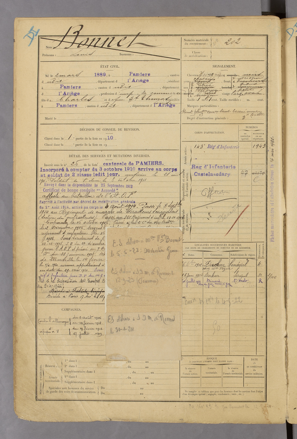 | Bonnet | Louis | FOIX | 129 W 47 | 1909 | Pamiers | Pamiers | 202 |