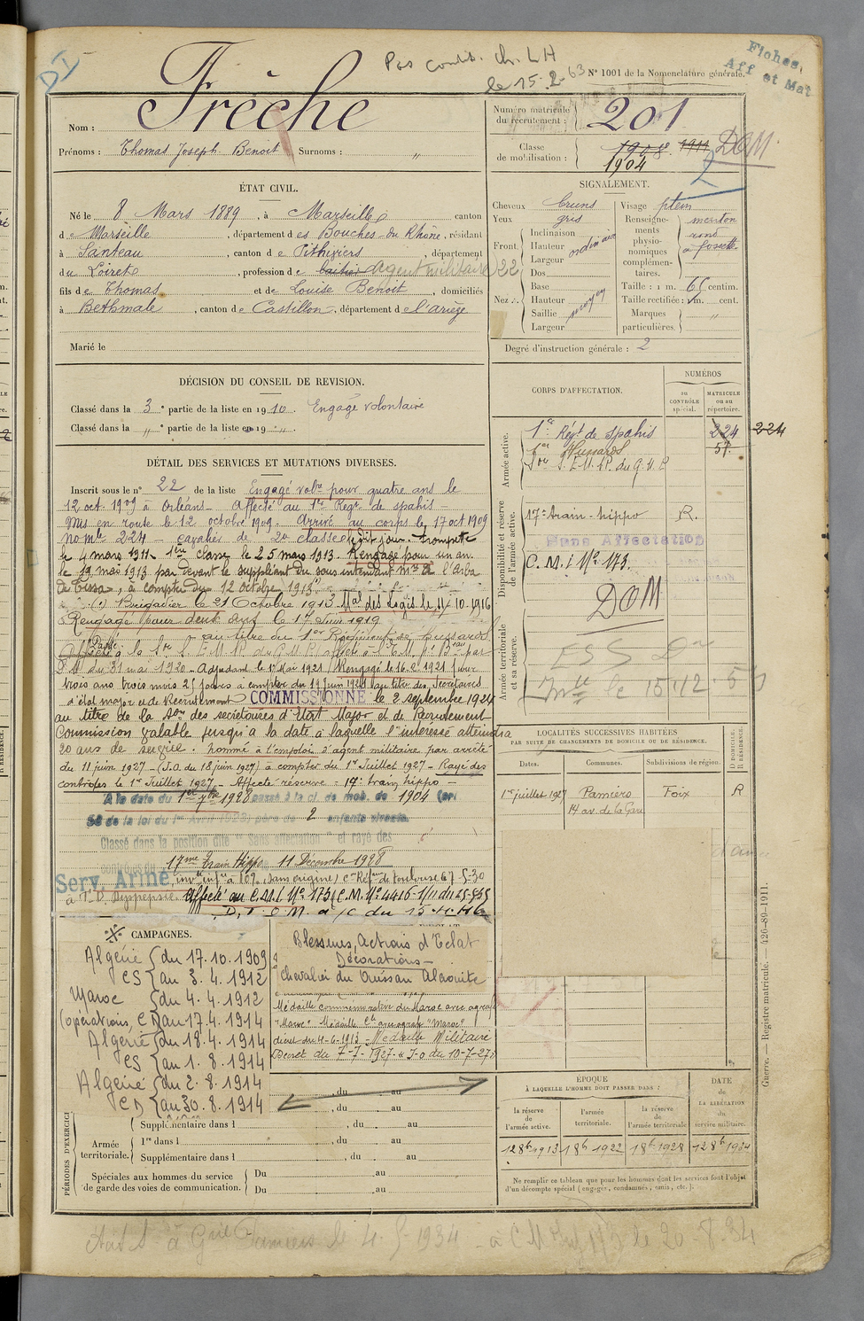 | Frèche | Thomas Joseph Benoit | FOIX | 129 W 50 | 1909 | Marseille | Santeau | 201 |