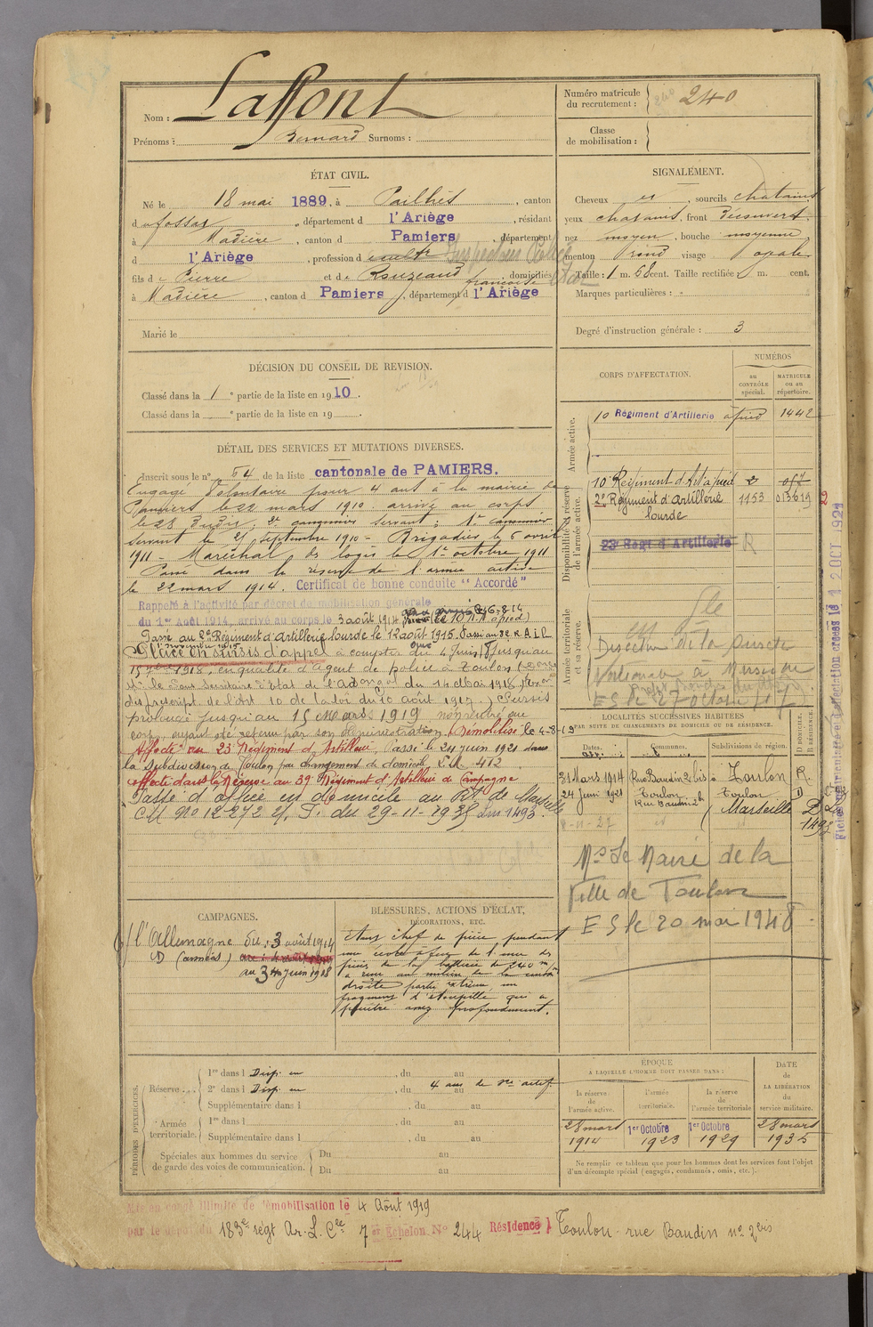 | Barbe | Joseph dit Clichou | FOIX | 129 W 50 | 1909 | Bethmale | Sully sur Loiret | 243 |
