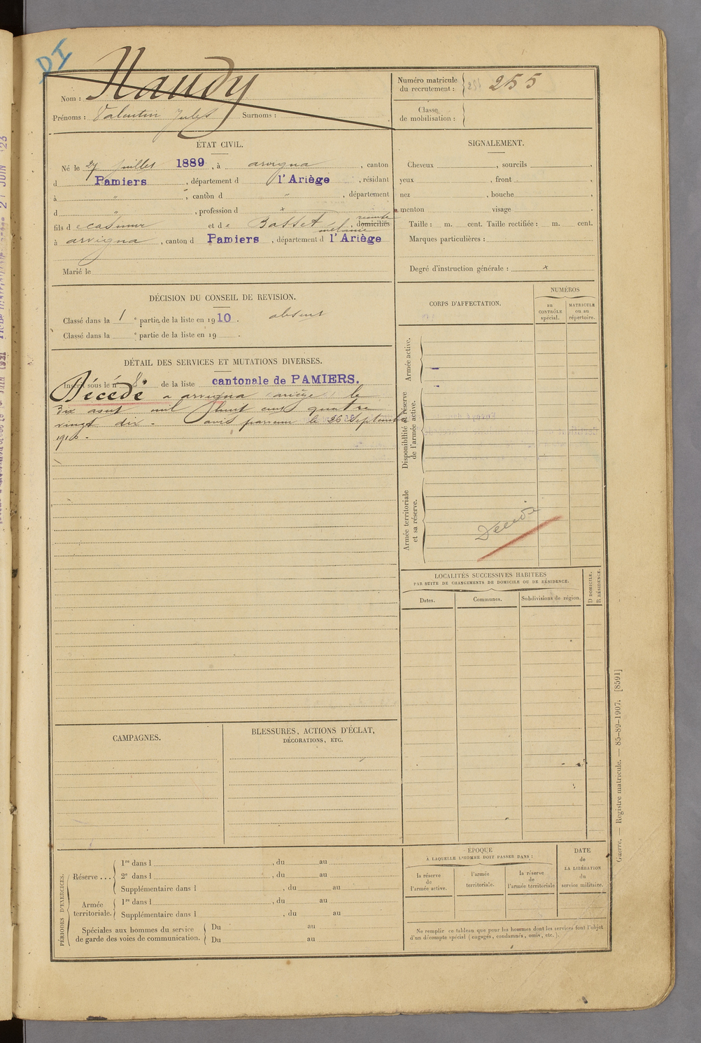 | Naudy | Valentin Jules | FOIX | 129 W 47 | 1909 | Arvigna | 255 |