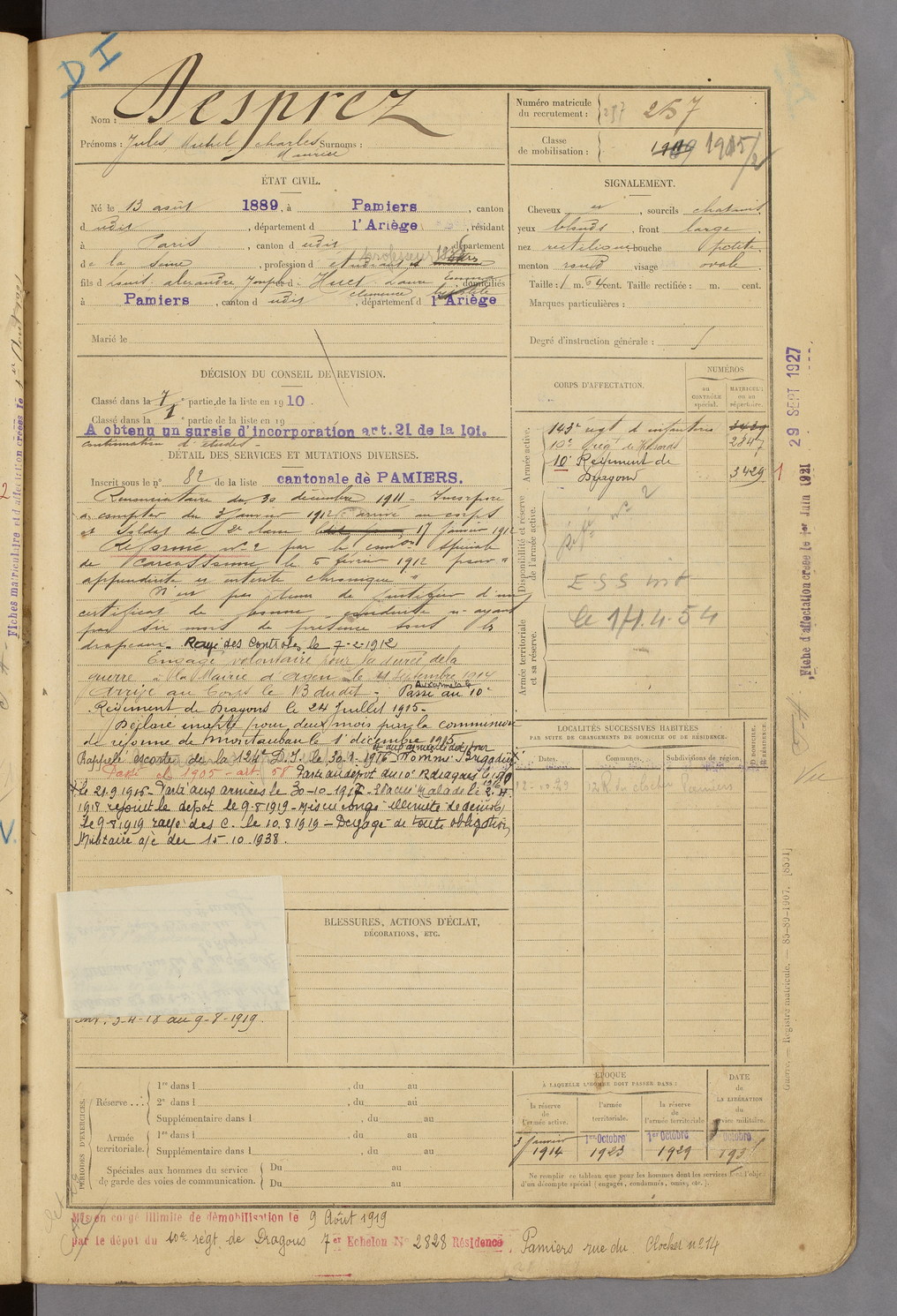| Desprez | Jules Michel Charles Maurice | FOIX | 129 W 47 | 1909 | Pamiers | Paris | 257 |