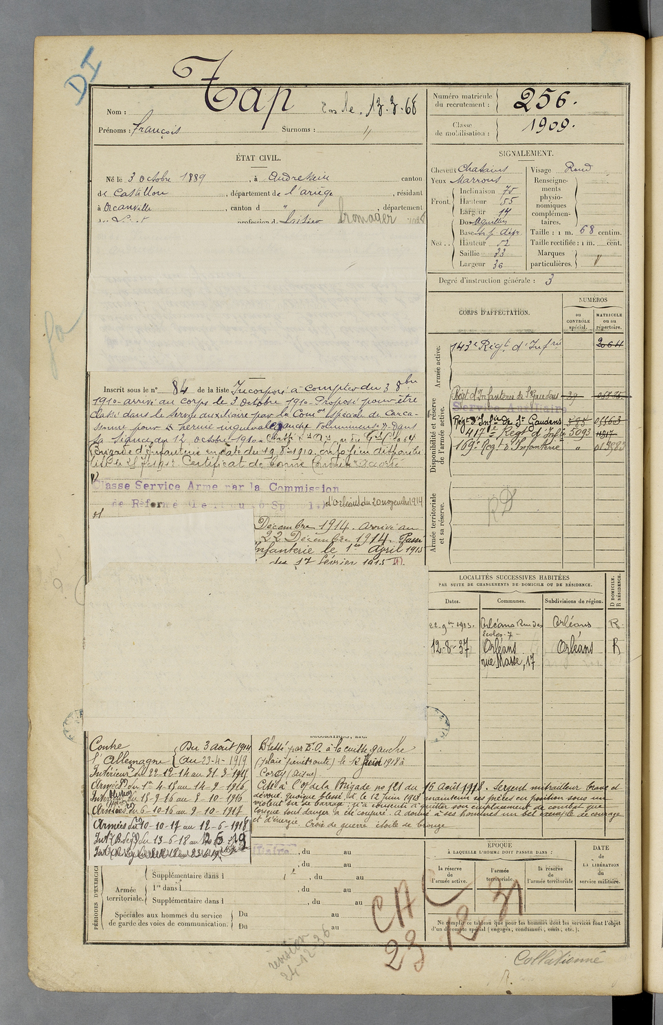 | Tap | François | FOIX | 129 W 50 | 1909 | Audressein | Orcanville | 256 |