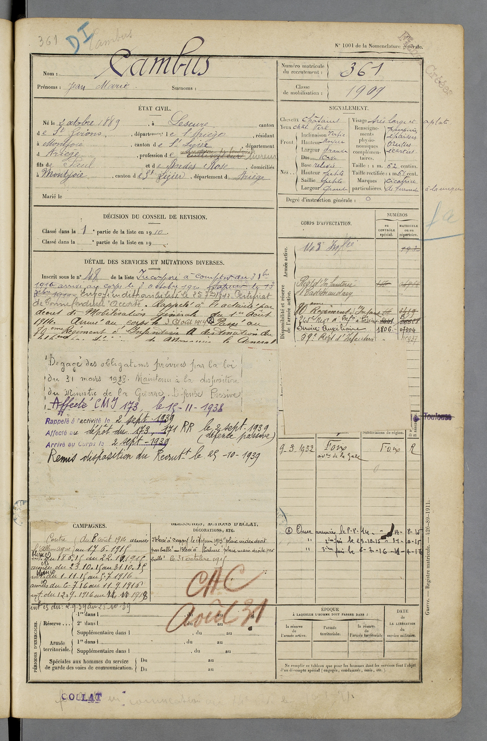 | Cambus | Jean Marie | FOIX | 129 W 50 | 1909 | Lescure | Montjoie | 361 |