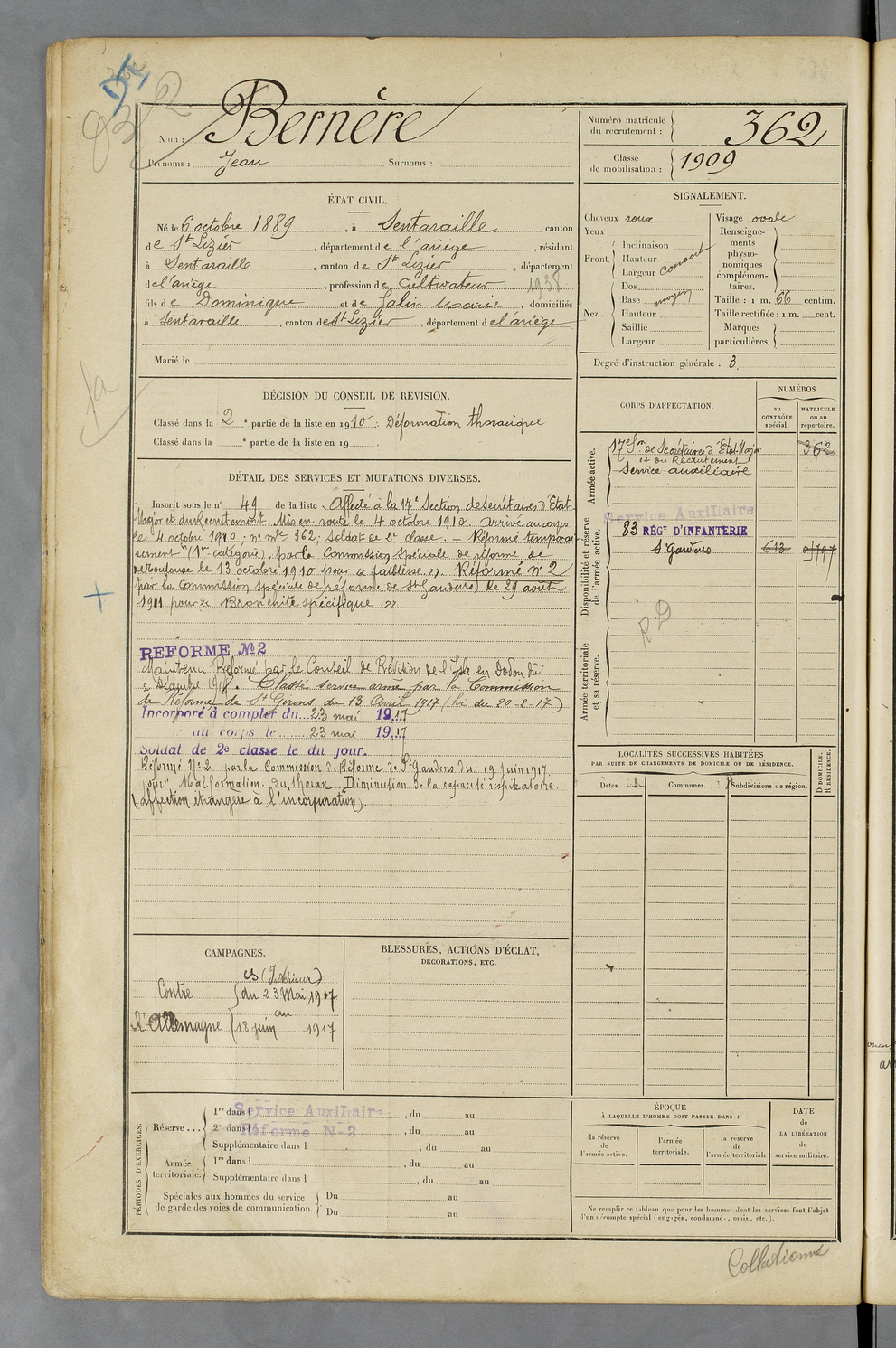 | Bernère | Jean | FOIX | 129 W 50 | 1909 | Sentaraille | Sentaraille | 362 |
