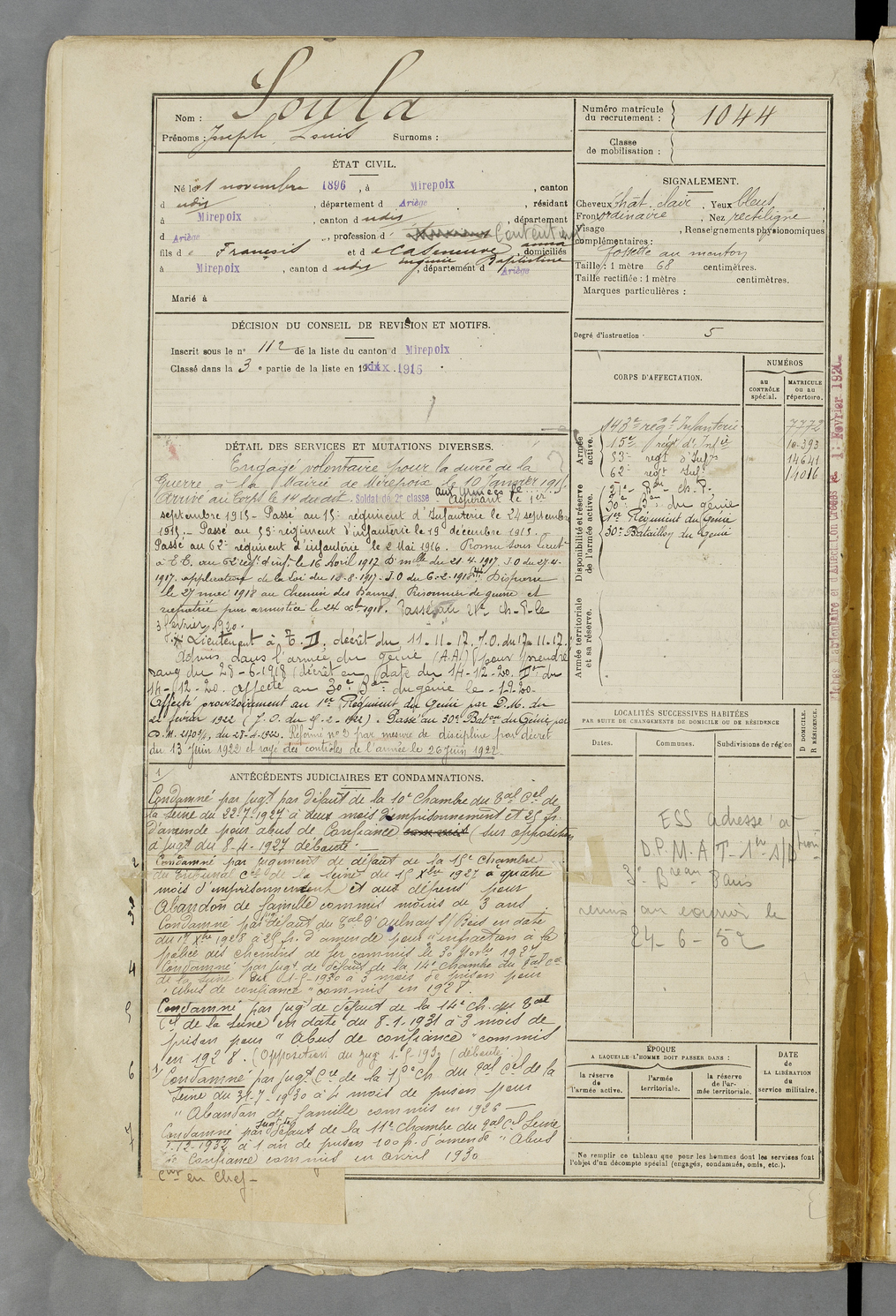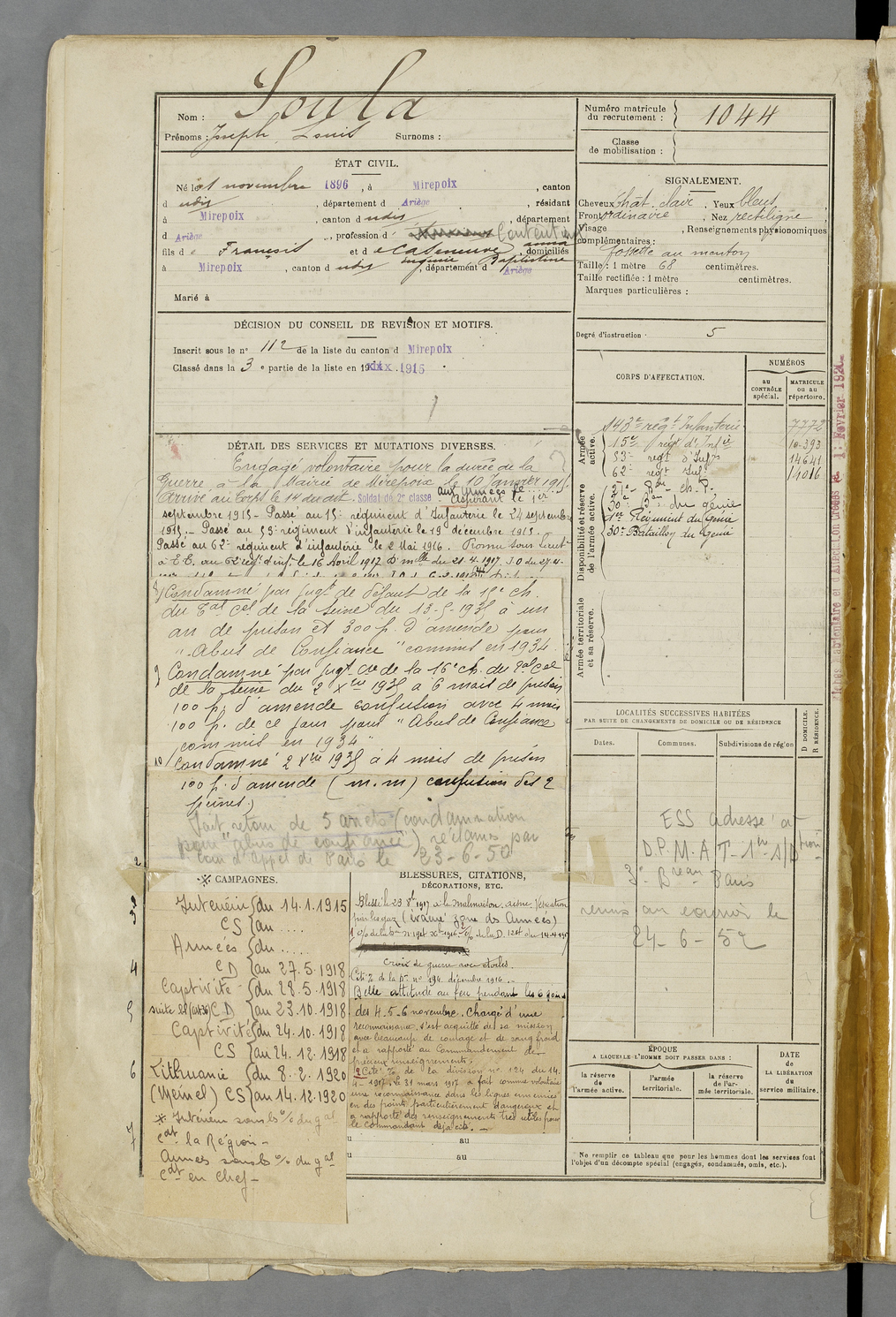 | Soula | Joseph Louis | FOIX | 129 W 83 | 1916 | Mirepoix | Mirepoix | 1044 |