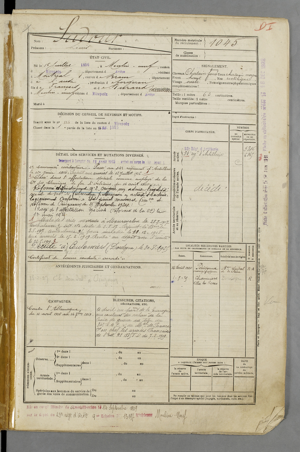 | Sudour | Louis | FOIX | 129 W 83 | 1916 | Moulin-Neuf | Montréal | 1045 |