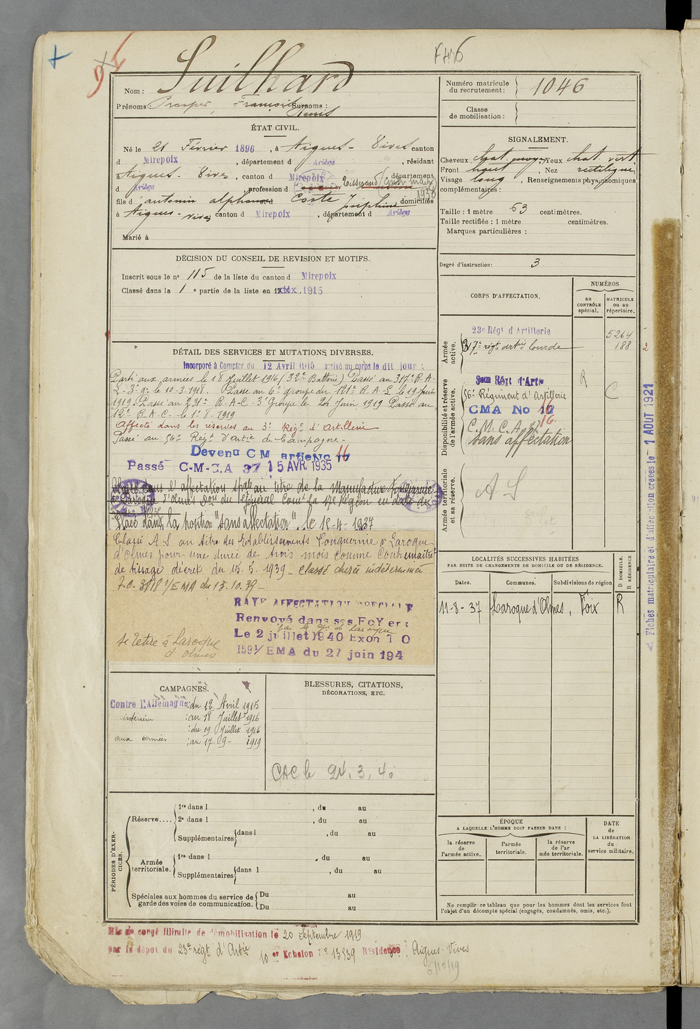 | Suilhard | Prosper François Denis | FOIX | 129 W 83 | 1916 | Aigues-Vives | Aigues-Vives | 1046 |