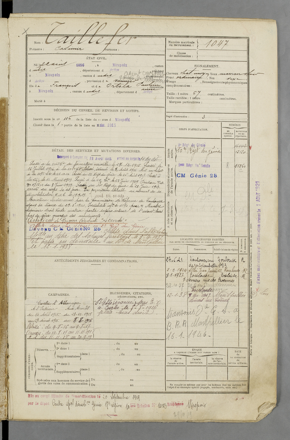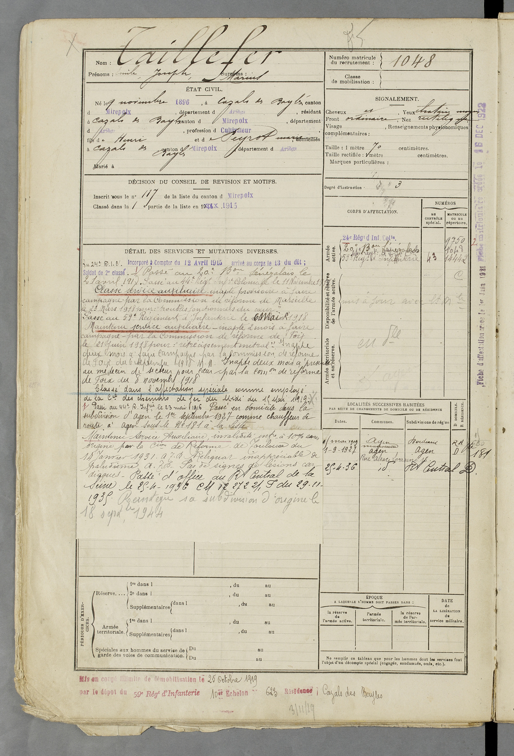 | Taillefer | Casimir | FOIX | 129 W 83 | 1916 | Mirepoix | Mirepoix | 1047 |