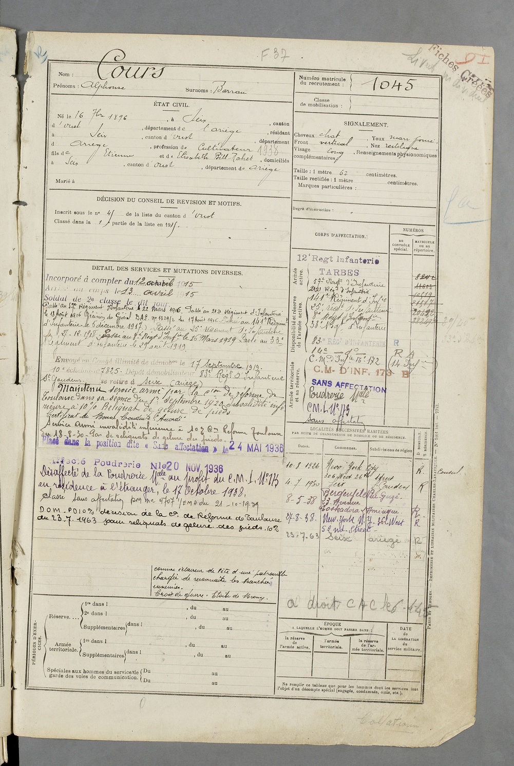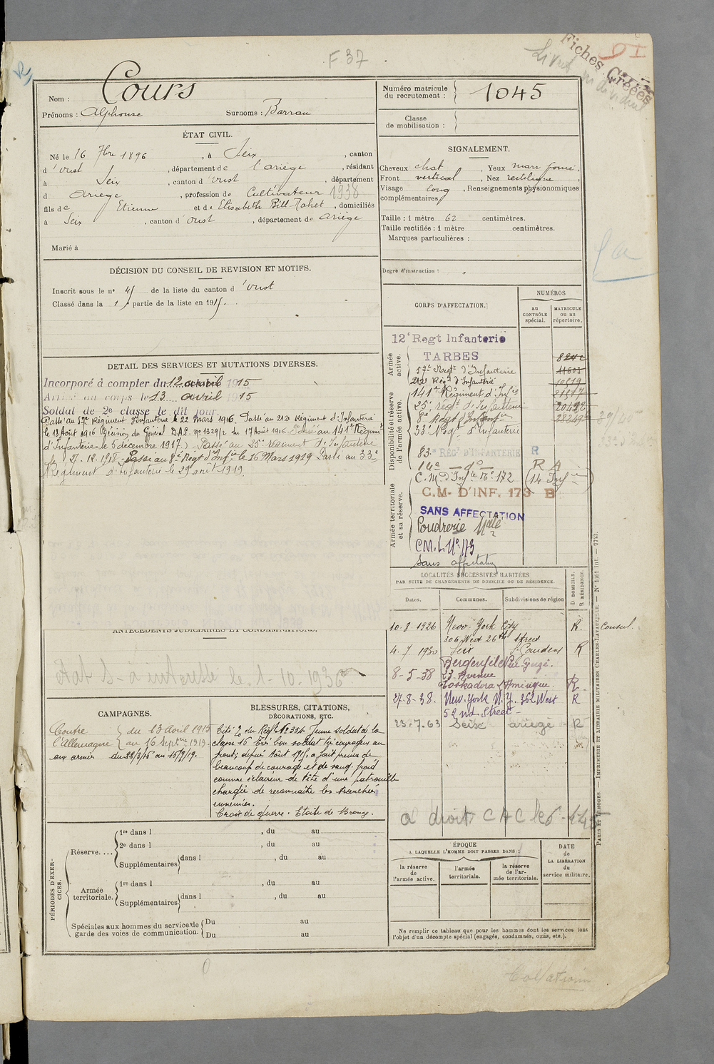 | Cours | Alphonse dit Barrau | FOIX | 129 W 84 | 1916 | Seix | Seix | 1045 |