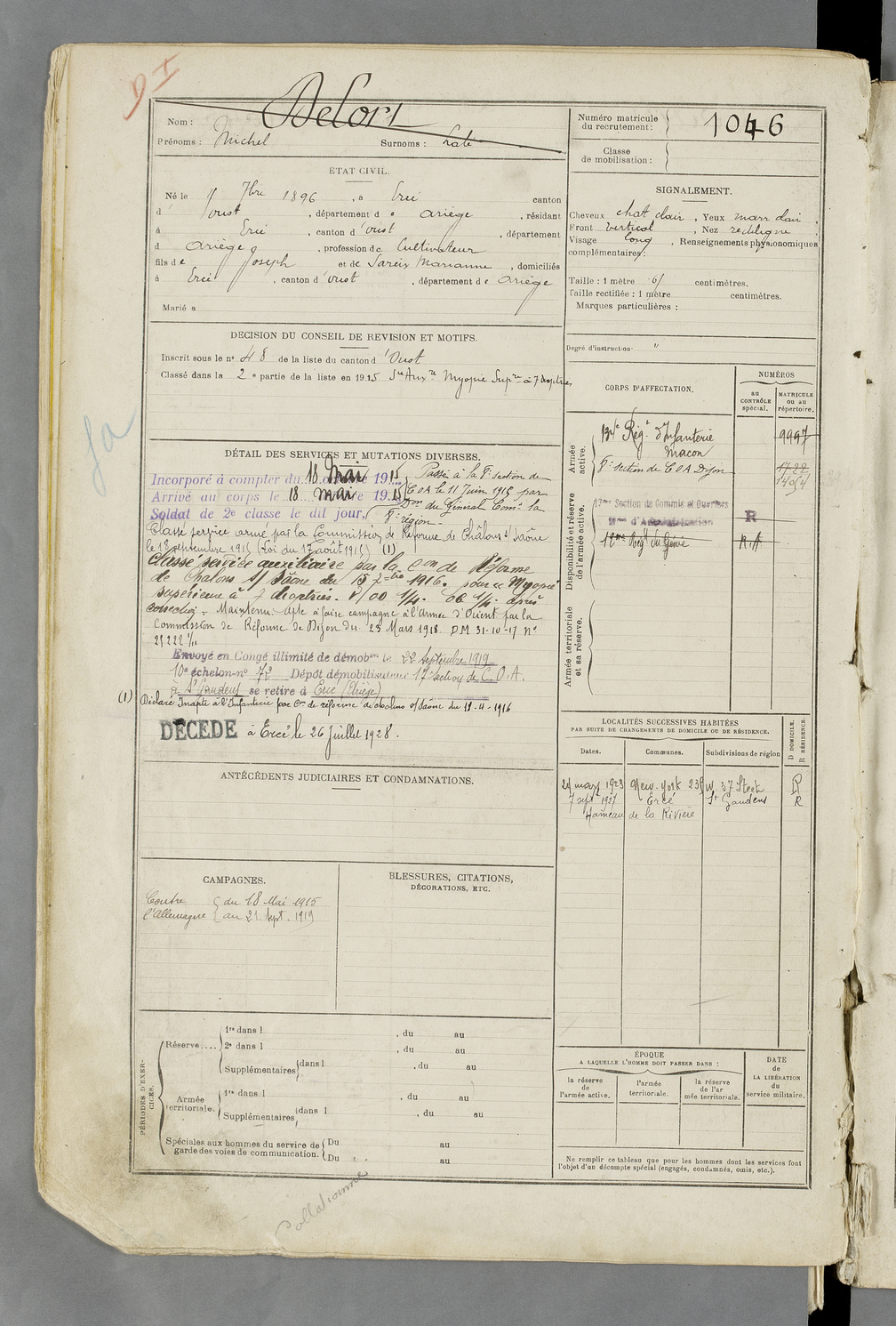 | Delort | Michel dit Laté | FOIX | 129 W 84 | 1916 | Ercé | Ercé | 1046 |
