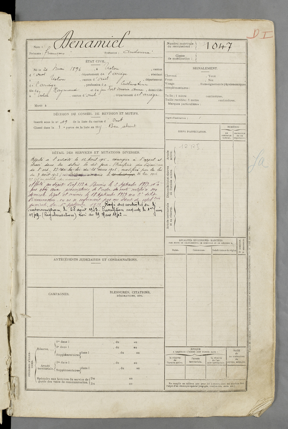 | Denamiel | François dit Andourra | FOIX | 129 W 84 | 1916 | Ustou | Ustou | 1047 |
