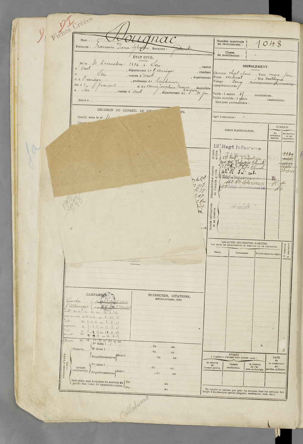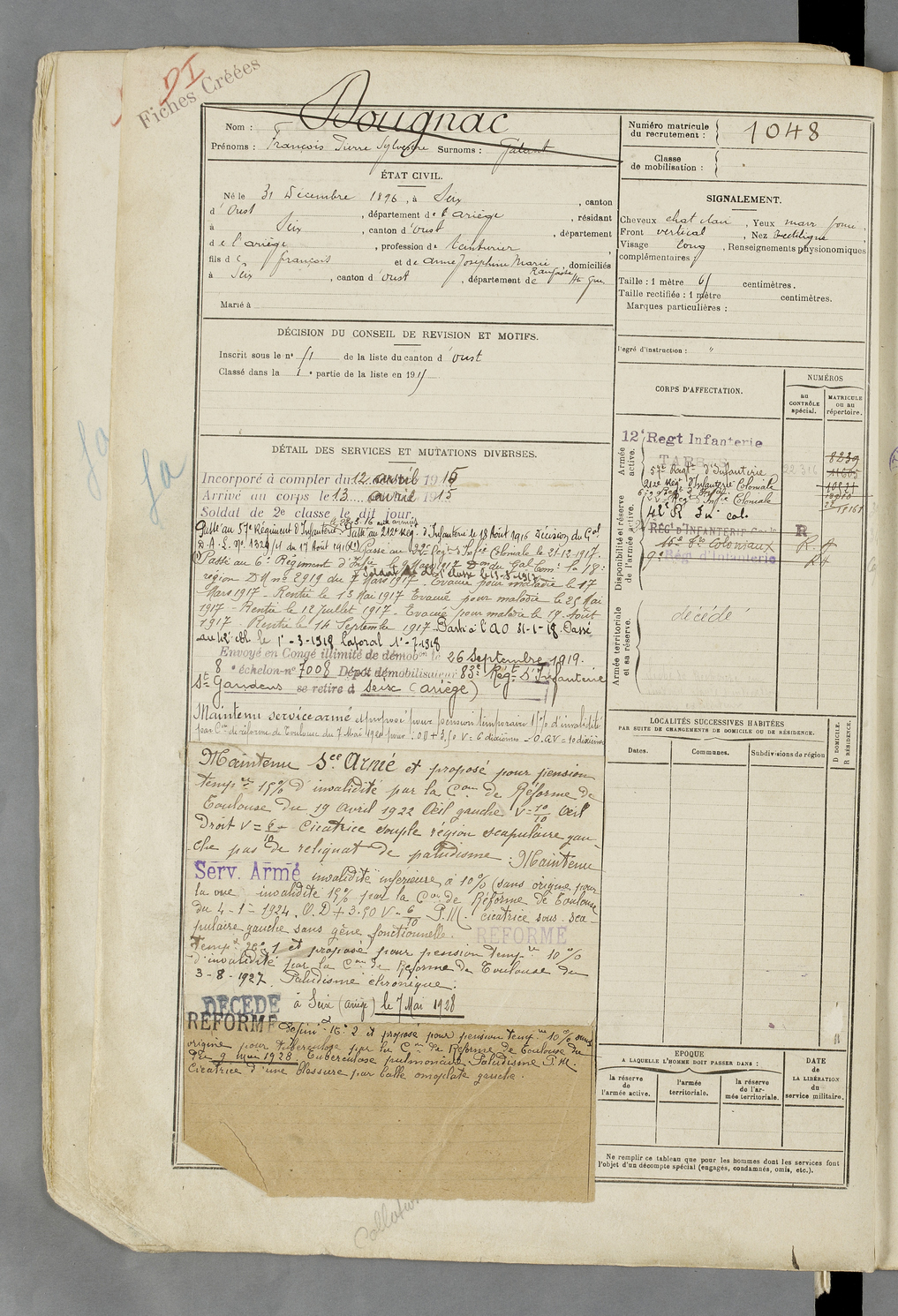 | Dougnac | François Pierre Sylvestre dit Galant | FOIX | 129 W 84 | 1916 | Seix | Seix | 1048 |