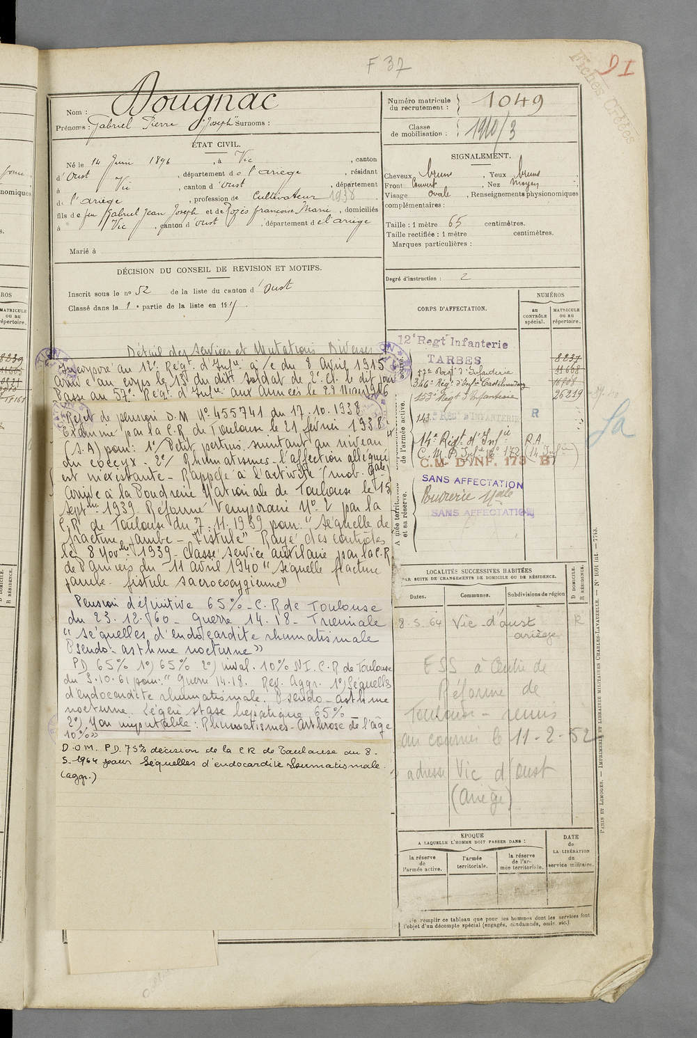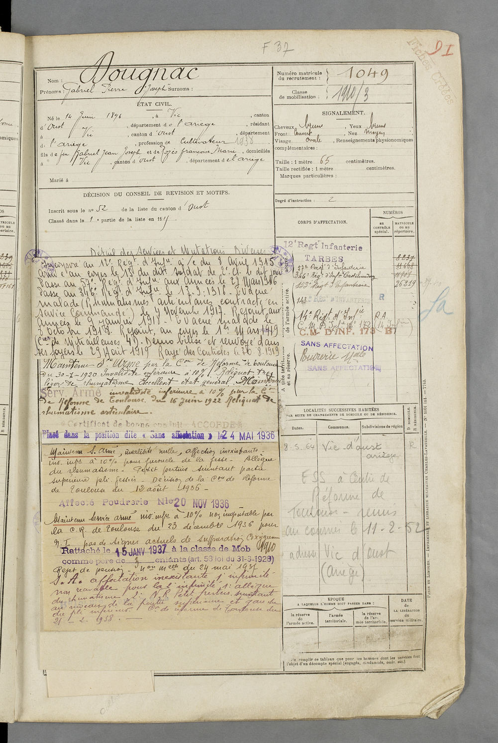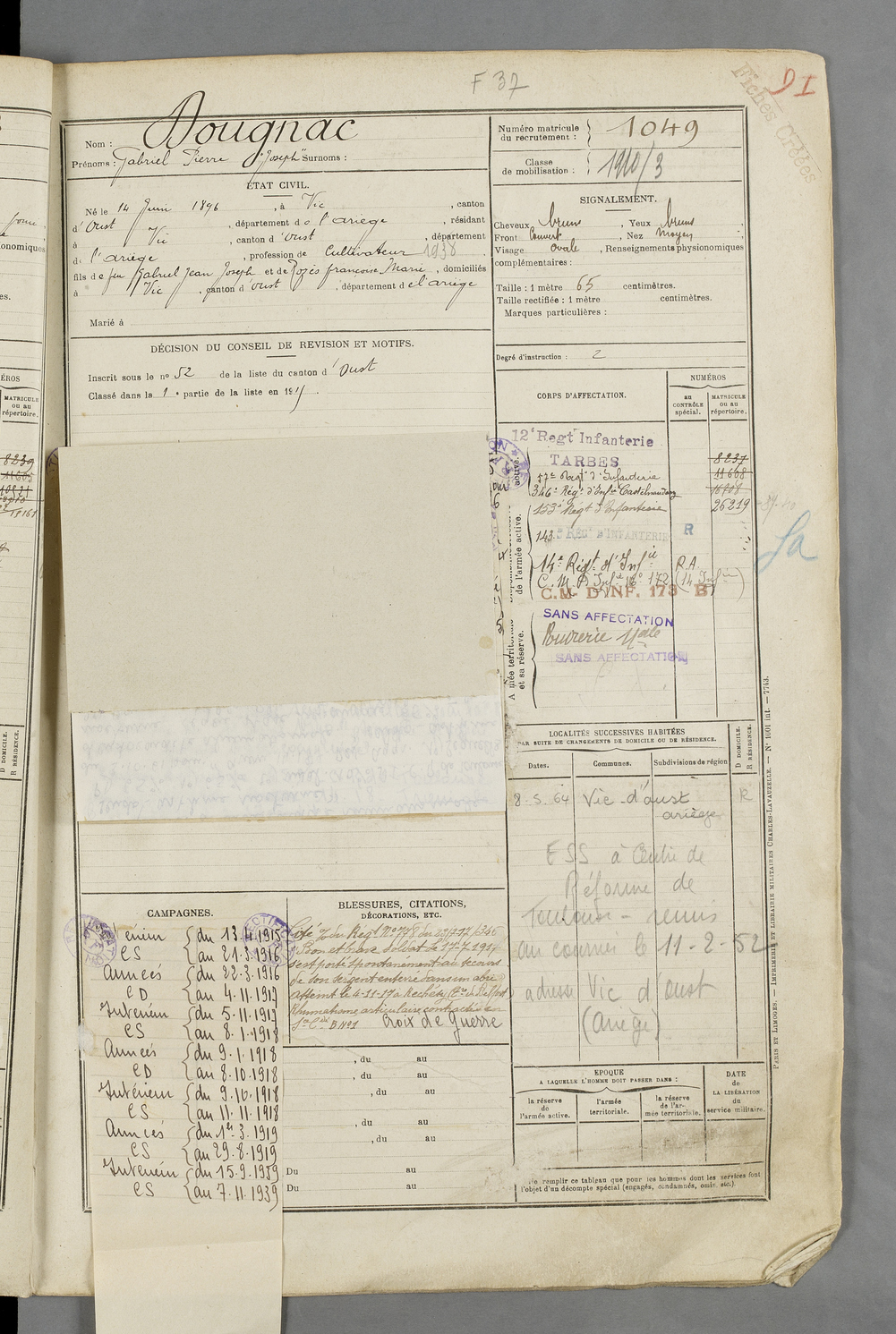 | Dougnac | Gabriel Pierre Joseph | FOIX | 129 W 84 | 1916 | Vic-d'Oust | Vic-d'Oust | 1049 |