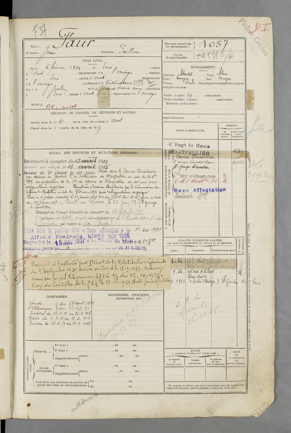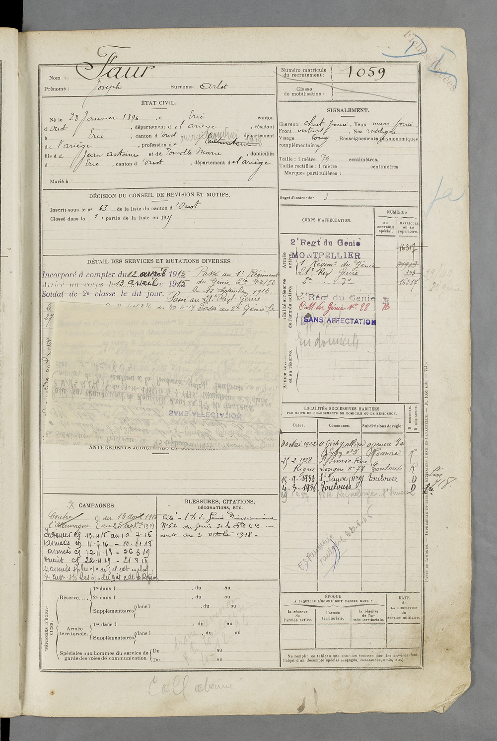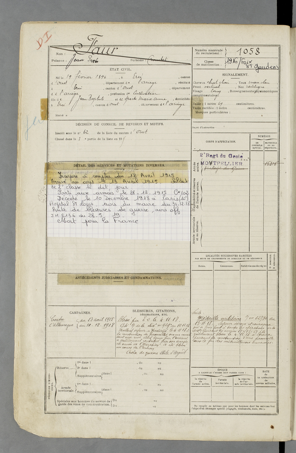 | Faur | Jean dit Paillou | FOIX | 129 W 84 | 1916 | Ercé | Ercé | 1057 |