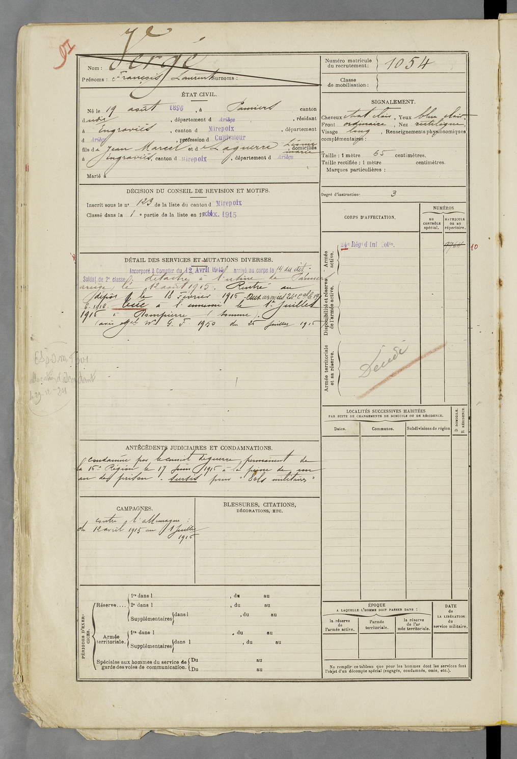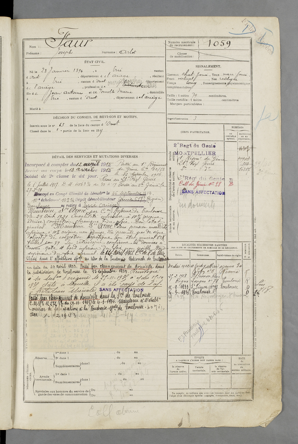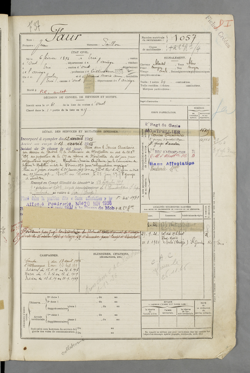 | Faur | Jean dit Paillou | FOIX | 129 W 84 | 1916 | Ercé | Ercé | 1057 |