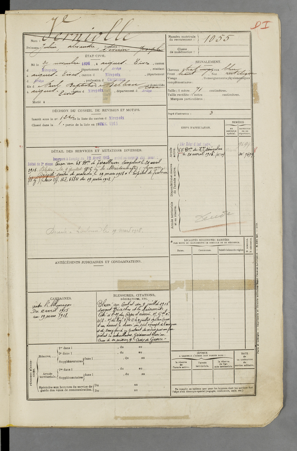 | Verniolle | Julien Alexandre Severin Joseph | FOIX | 129 W 83 | 1916 | Aigues-Vives | Aigues-Vives | 1055 |