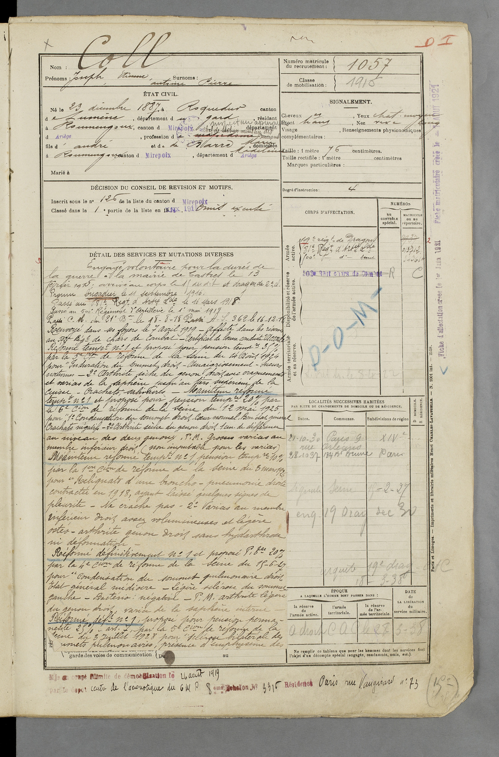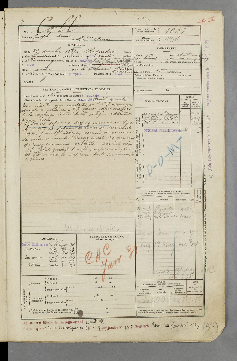 | Coll | Joseph Etienne Antoine Pierre | FOIX | 129 W 83 | 1916 | Roquedur | Roumengoux | 1057 |