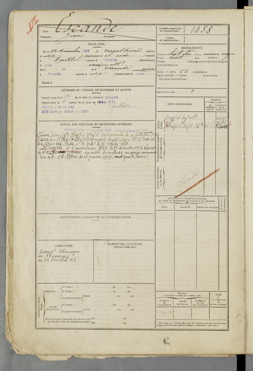 | Escande | Jean | FOIX | 129 W 83 | 1916 | Carcassonne | Montbel | 1058 |