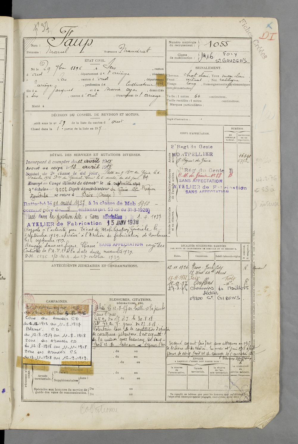 | Faup | Marcel dit Mandrat | FOIX | 129 W 84 | 1916 | Seix | Seix | 1055 |