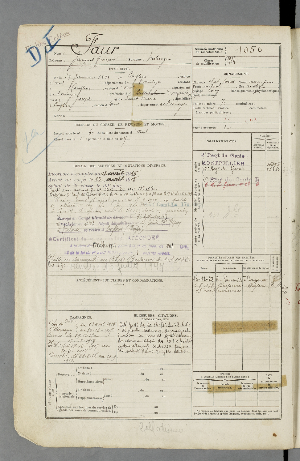 | Faur | Jacques François dit Maletagne | FOIX | 129 W 84 | 1916 | Couflens | Couflens | 1056 |