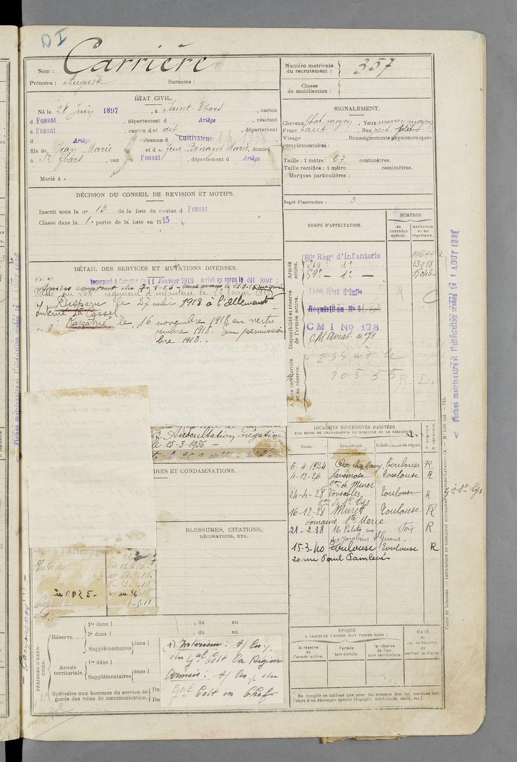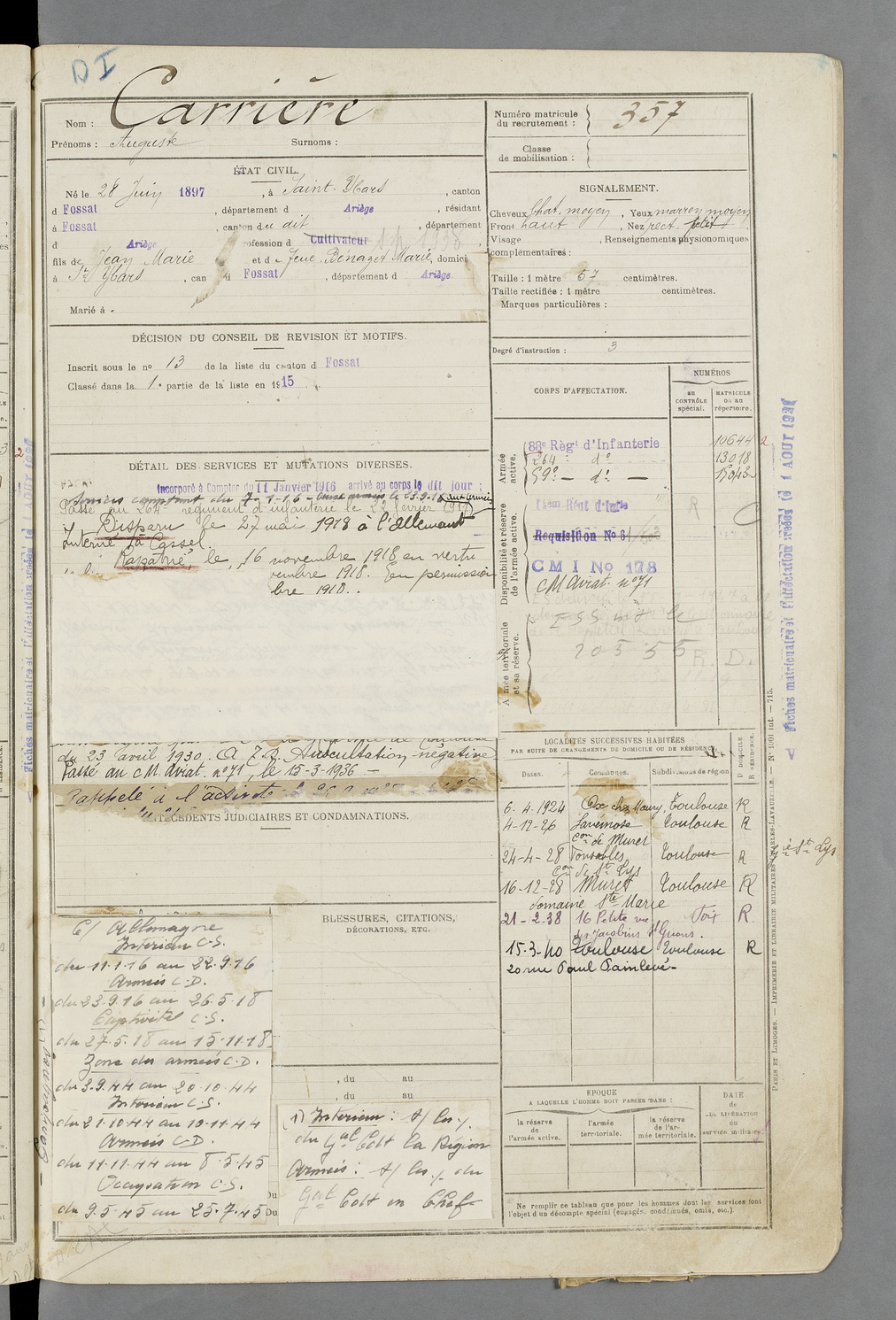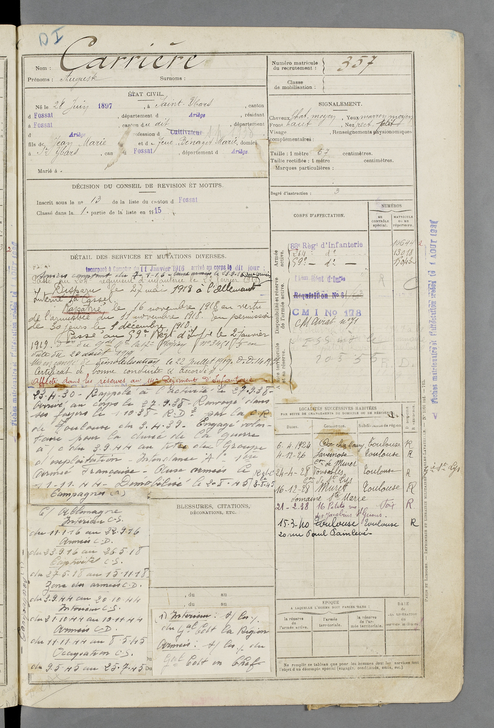 | Carrière | Auguste | FOIX | 129 W 87 | 1917 | Saint-Ybars | Fossat (Le) | 357 |