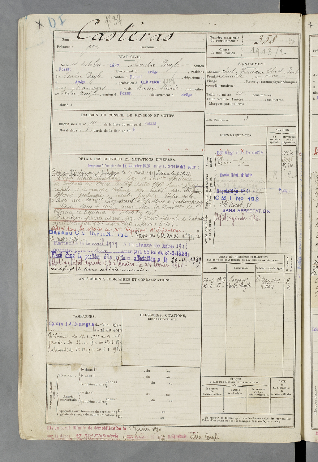 | Castéras | Jean | FOIX | 129 W 87 | 1917 | Carla-Bayle (Le) | Carla-Bayle (Le) | 358 |