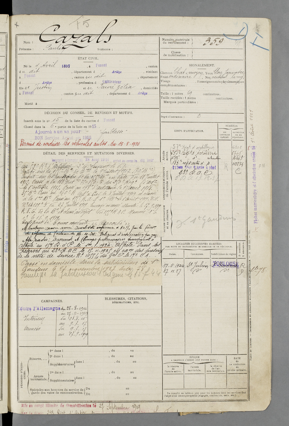 | Cazals | Paulin | FOIX | 129 W 87 | 1917 | Fossat (Le) | Fossat (Le) | 359 |